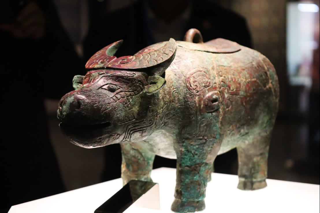 甲骨展區堪稱「文化濃度超標」。一片片龜甲獸骨上刻滿了神秘符號,這些符號正是世界上最古老的文字之一——甲骨文。媒體成員們湊近展櫃,仔細端詳這些刻辭,傾聽着講解員解讀甲骨文背後的故事,直觀感受殷商的政治、經濟與生活。大家一邊聽一邊拍,生怕錯過這些「活歷史」。行至博物館三層,亞長牛尊、青銅手型器等「網紅文物」隨即亮相,獨特造型格外吸睛,引眾人駐足合照。