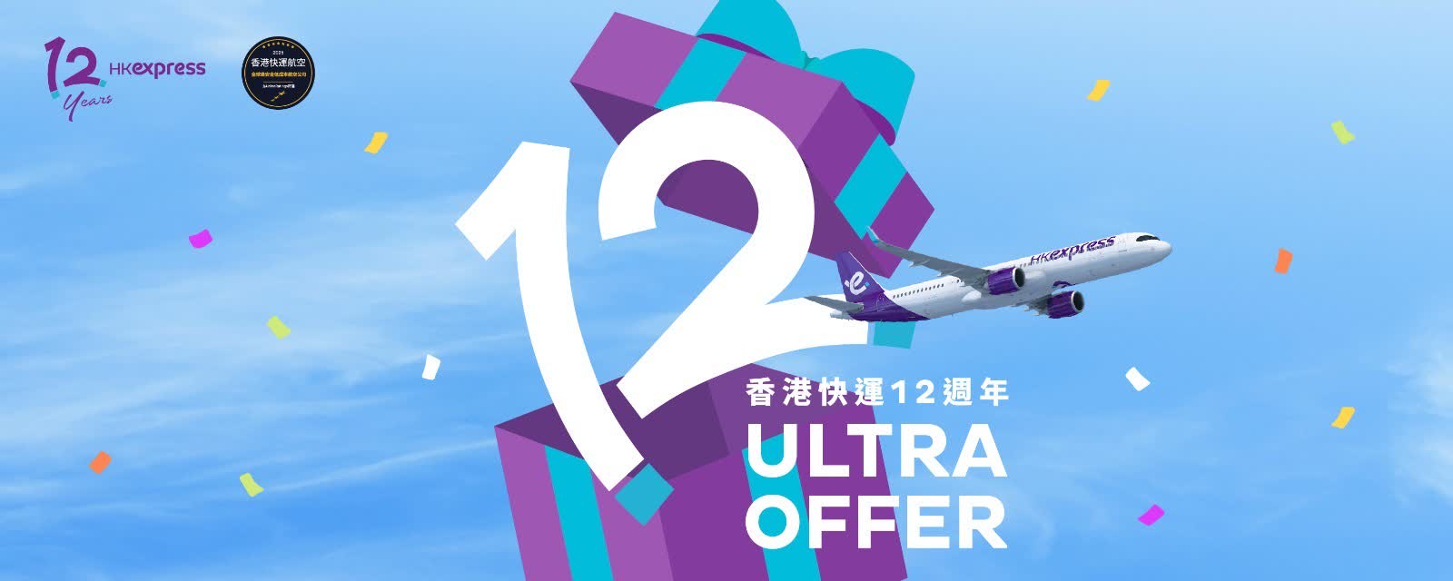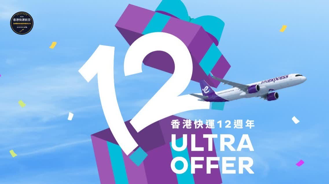 香港快運航空(香港快運)已陪伴大家翱翔天際12年,為感謝每一位旅客的支持與信任,香港快運特別推出12周年Ultra Offer,以超震撼優惠回饋旅客。