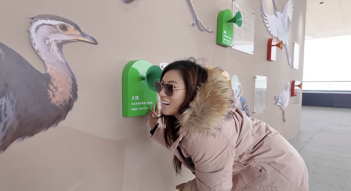 雄安圖書館坐落於啟動區,總建築面積約6.8萬平方米,內設休閒閱覽區、電子閱覽室、書香會客廳、空中花園等多功能特色主題空間。其中,七層空中花園成為最大亮點。綠植環繞的開放閱讀空間、玻璃穹頂灑下的自然光線,打造出「人在景中讀」的愜意氛圍。團員蕭蘭蘭在圖書館「白洋淀飛鳥展」互動區挪不開腳步,按下按鈕聽到斑嘴鴨、白鷺的清脆鳴叫時,忍不住笑着反覆嘗試,「這個裝置太有趣了!本來靜態的展覽,因為這些鳥聲一下子就活了。」團員謝宇慧則坐在綠植環繞的閱讀區,輕聲感嘆:「這種綠色生態和圖書館裝置結合的感覺,太舒適了,就像在自然裏看書,非常愜意。」