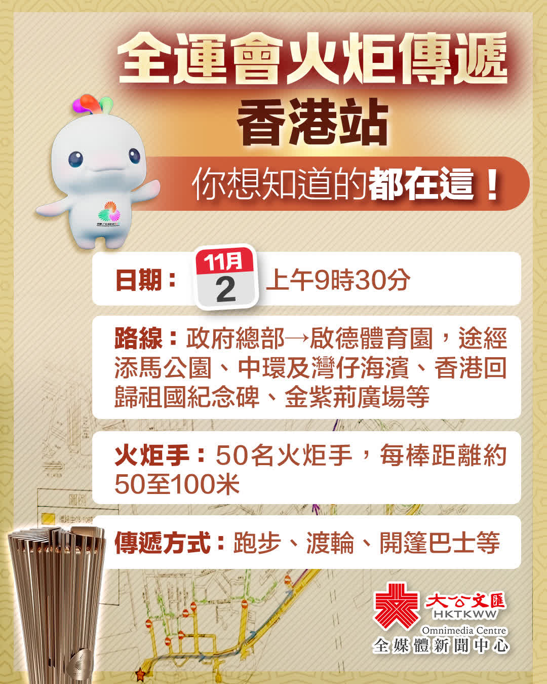 (大公文匯全媒體記者 周傾芫)第十五屆全國運動會火炬傳遞香港站記者會今日(27日)舉行,由全運會香港賽區統籌辦公室主任楊德強,聯同香港警務處及運輸署代表,跨部門詳細介紹火炬傳遞香港站的路線及相關交通運輸安排。火炬傳遞將於11月2日上午在香港、澳門、廣州及深圳4地同步進行,4座城市共設200棒火炬傳遞,每城市各50棒,每棒距離約50至100米。