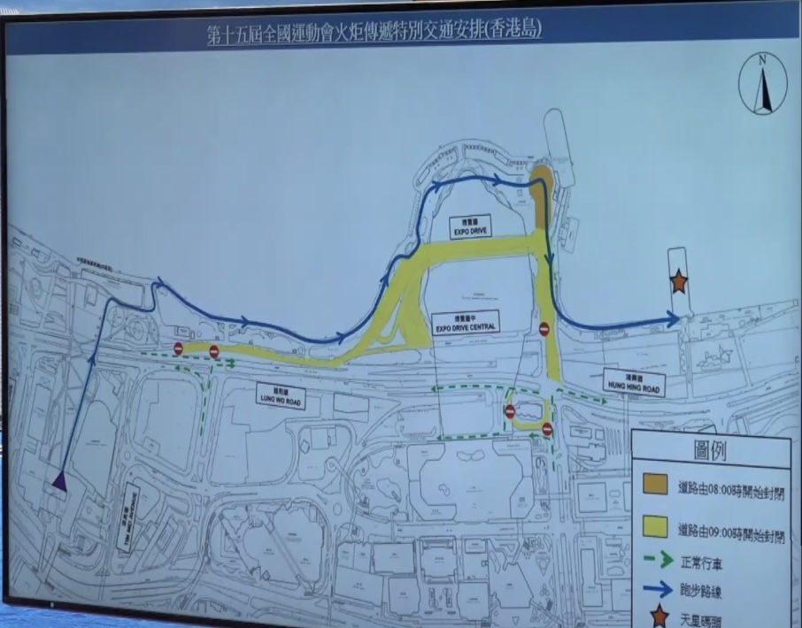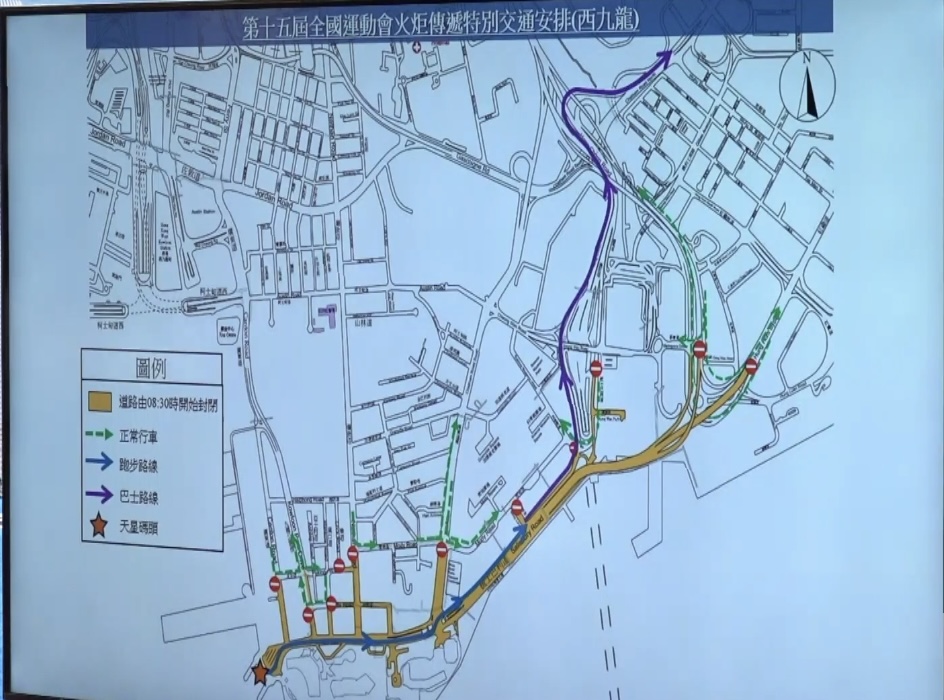 ▷東九龍區:啟德主場館的上落客區將於上午8時起封閉;火炬傳遞巴士路段將經東九龍走廊、九龍城道及宋皇臺道進入啟德體育園,因此這些路段亦會間接性封閉。