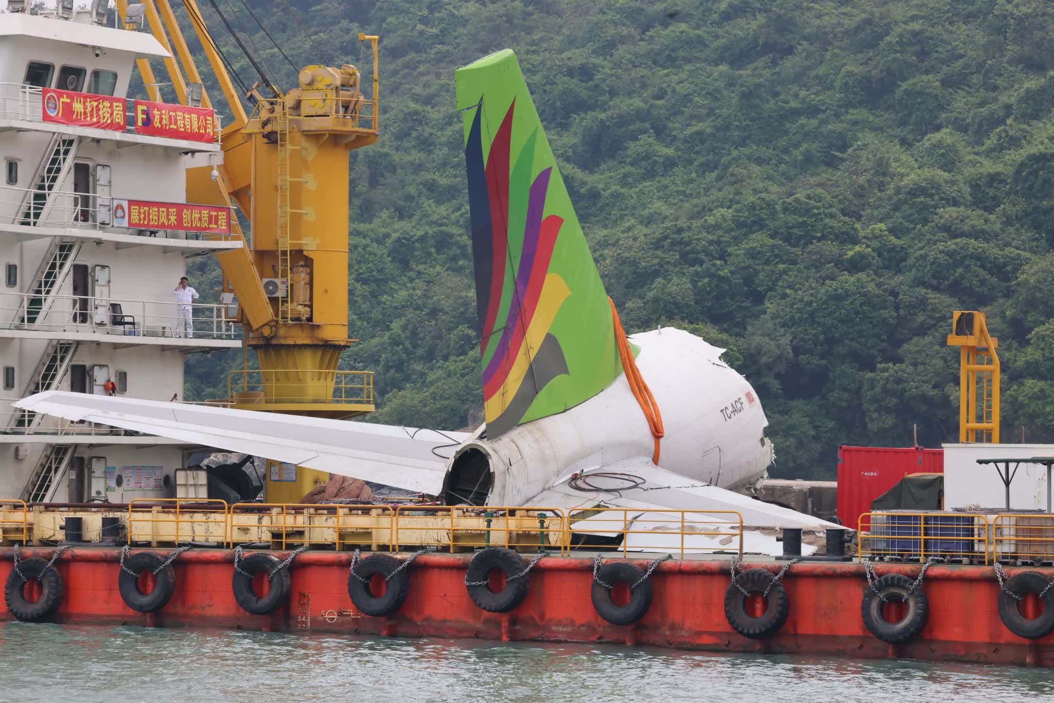 今日早上10時許,打撈船「南天鵬」將貨機機尾運走,而昨日打撈起的前半部貨機機身及機頭則置放在半潛船「重任1500」,亦於早上11時許往大嶼山欣澳方向運走。直至下午,貨機的機尾、前半部機身及機頭相繼運抵倒扣灣,但見貨機的機頭損毀最為嚴重,引擎、右邊機翼與機身銜接部分亦有明顯損毀;其間,打撈船工人在船上及岸上進行協調,規劃署及警方新界南刑事部探員,相繼抵達現場了解情況。
