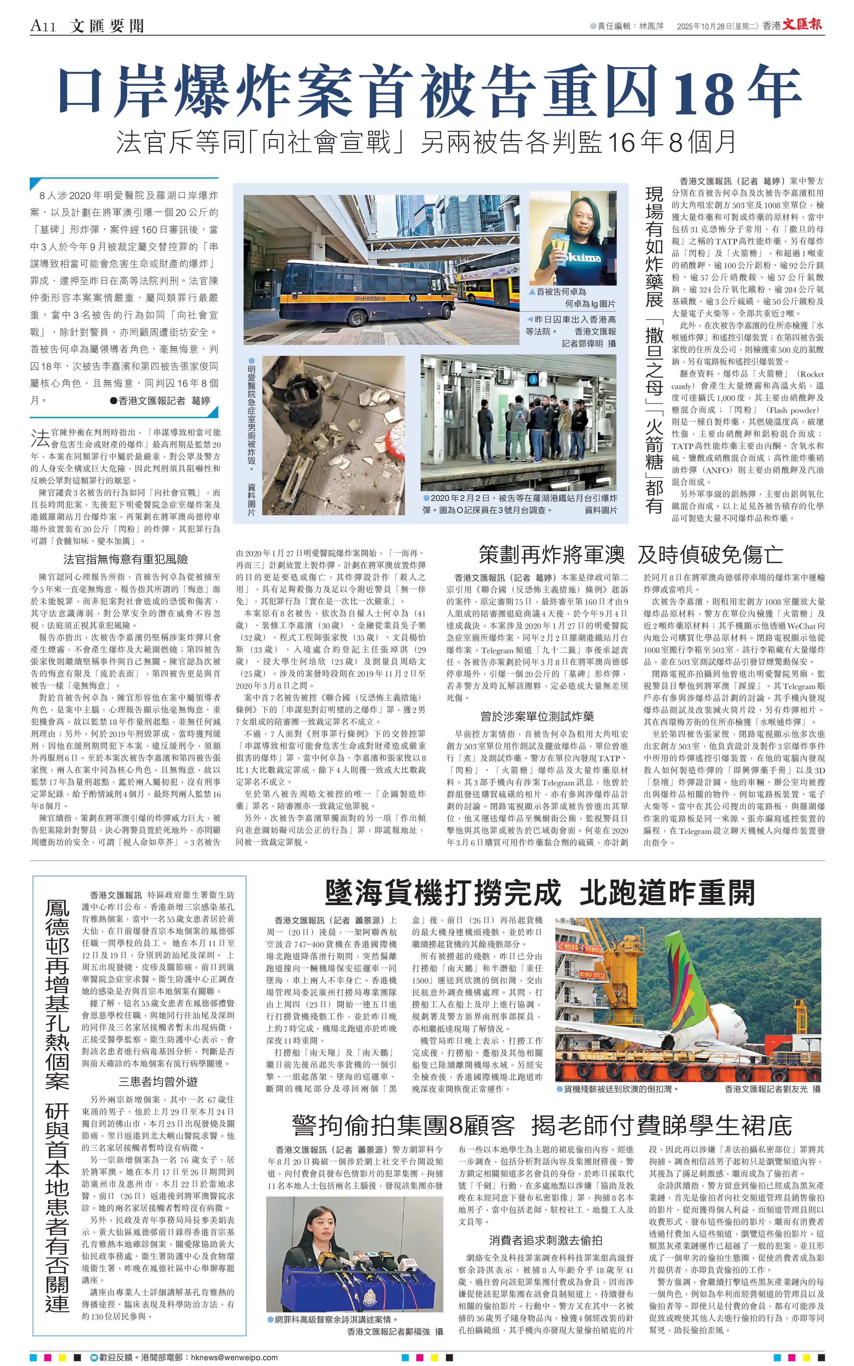 (香港文匯報 記者 葛婷)8人涉2020年明愛醫院及羅湖口岸爆炸案,以及計劃在將軍澳引爆一個20公斤的「墓碑」形炸彈,案件經160日審訊後,當中3人於今年9月被裁定屬交替控罪的「串謀導致相當可能會危害生命或財產的爆炸」罪成,還押至昨日在高等法院判刑。法官陳仲衡形容本案案情嚴重,屬同類罪行最嚴重,當中3名被告的行為如同「向社會宣戰」,除針對警員,亦罔顧周遭街坊安全。首被告何卓為屬領導者角色,毫無悔意,判囚18年,次被告李嘉濱和第四被告張家俊同屬核心角色,且無悔意,同判囚16年8個月。