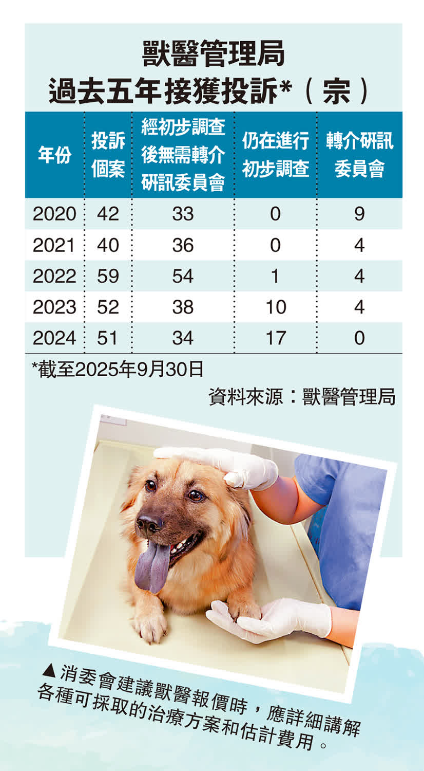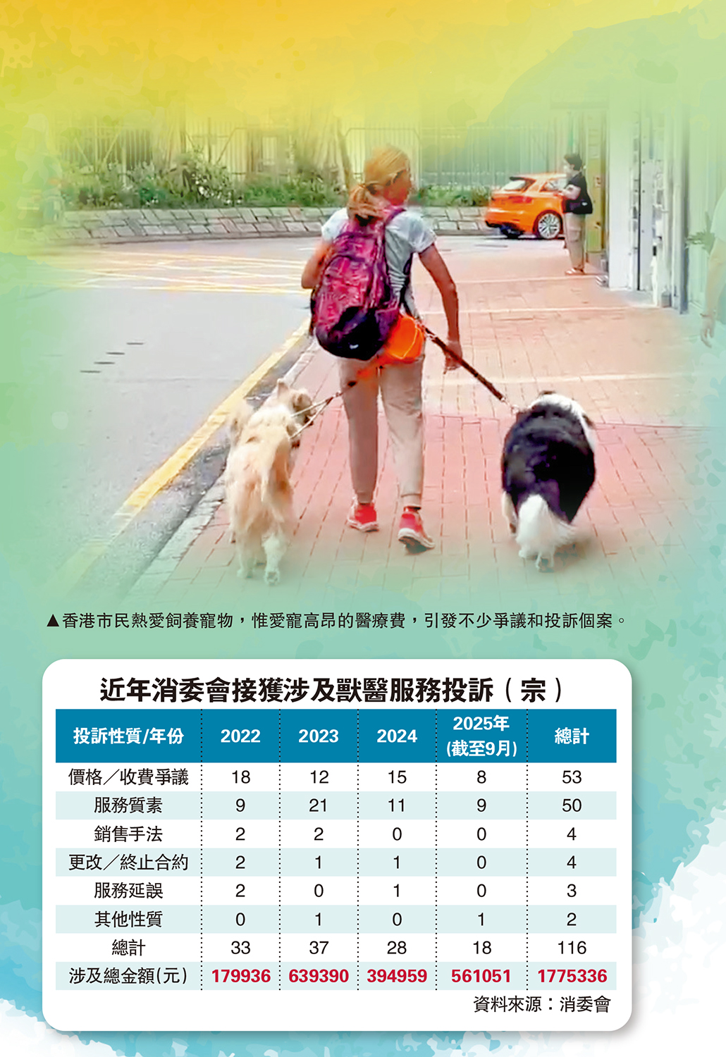 消委會近年接獲的投訴之中,不乏獸醫服務收費爭議,內容涉及收費透明度及退款安排等,由2022年至2025年九月涉及總金額逾177萬元,當中最高金額的一宗投訴個案,總共涉款約26萬元。
