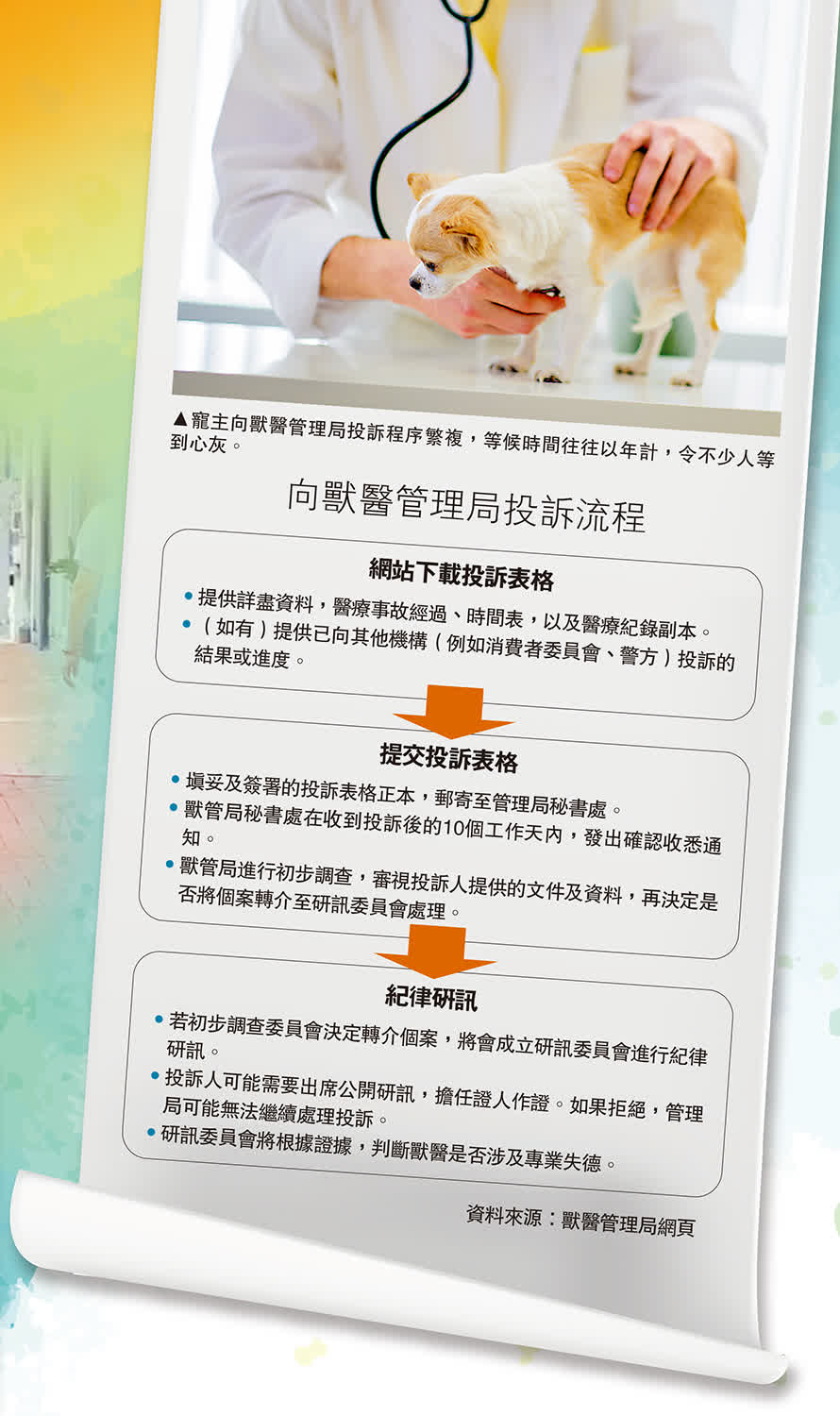 有關注寵物權益的區議員表示,曾經接獲不少市民求助,但就算向獸醫管理局投訴,由搜集證據至排期研訊,等候時間往往以年計,最終唯有不了了之,建議獸醫管理局加強公眾知情權,優化對獸醫服務的管理,恢復市民對寵物治療的信心。