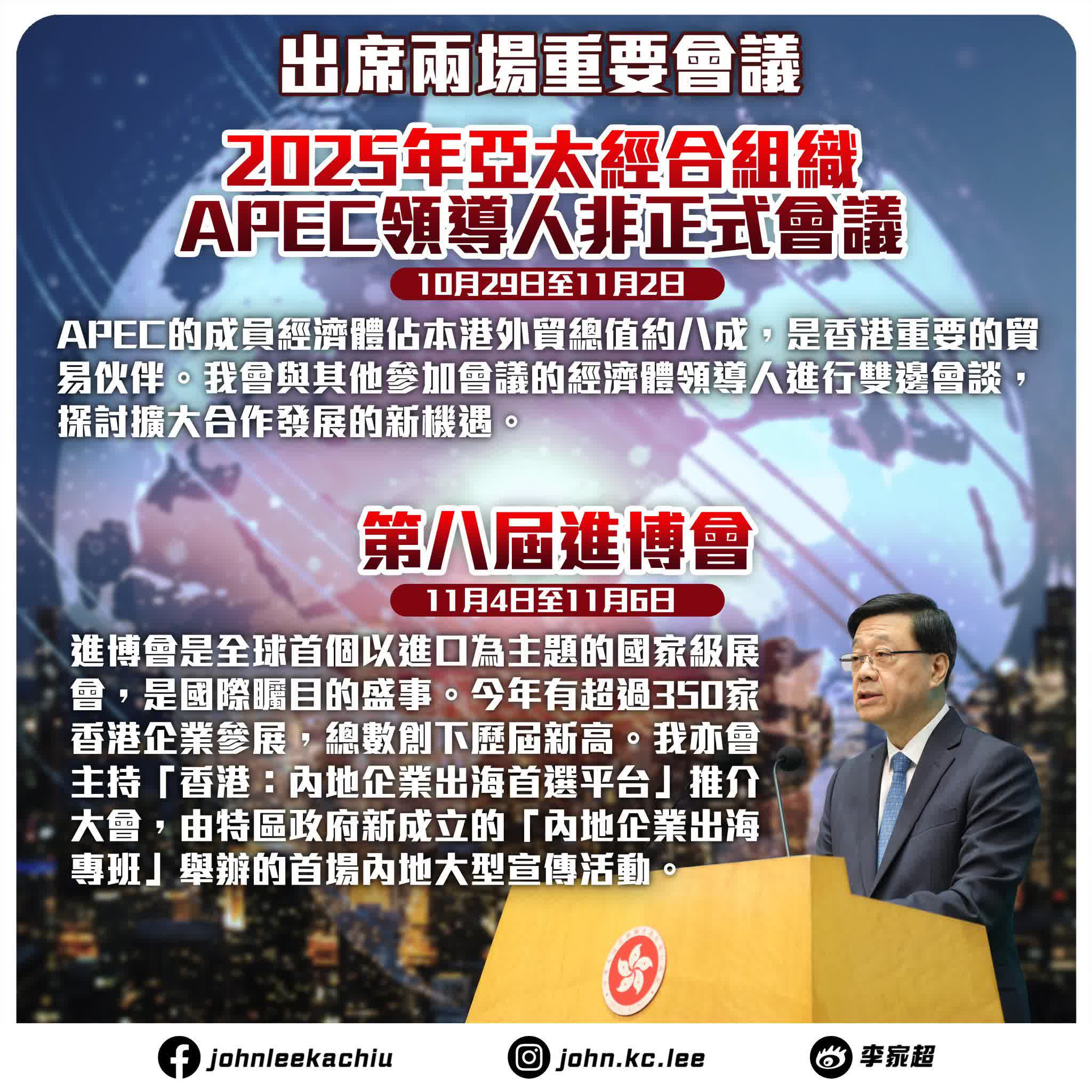 李家超將啟程前往韓國出席APEC領導人非正式會議。他表示,將參與亞太經合組織領導人會議,以及主辦方為與會領袖所設的歡迎晚宴;亦會與其他參加會議的經濟體領導人進行雙邊會談,探討擴大合作發展的新機遇。他說,「APEC是香港進一步加強與區內經貿合作的重要平台,香港近年在深化國際經貿網絡、招商引資、推動人工智能和科技革新等方面,都以改革思維,推出不少新措施,期待在APEC會議上分享香港在這些領域的政策和經驗。」