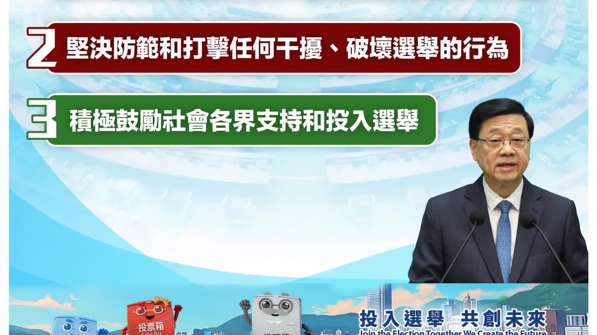 特區政府會在三方面全力推動和落實好選舉工作:第一,確保選舉公平、公正、誠實、安全有序舉行;第二,堅決防範和打擊任何干擾、破壞選舉的行為;第三,積極鼓勵社會各界支持和投入選舉,共同參與建設香港更好未來。投票是每位選民都應履行的公民責任,今天發信給所有公務員同事,呼籲及鼓勵他們以身作則,履行公民責任,踴躍投票。他說,「我再次呼籲大家必須珍惜手中選票,在12月7日踴躍投票,選賢與能,為香港共同家園的更美好未來投下神聖的一票。」