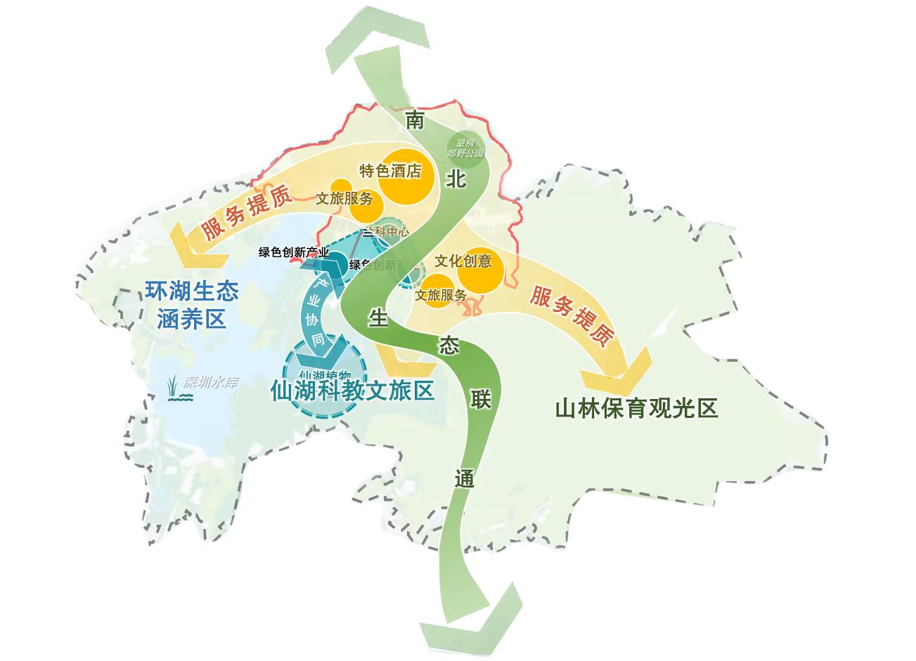 根據綱要,未來的大梧桐生態融合區將形成「山水園城,四區融合」的總體格局,打造深圳戶外運動目的地、灣區康養度假引領地、國家生態文明示範地,以及新質文旅產業新高地。其中,南側以梧桐山風景名勝區為主體,規劃了山林保育觀光區、環湖生態涵養區、仙湖科教文旅區三個片區。北側則規劃了生態融合提升區,包括水岸休閒街區、生態科創街區、山麓文創街區以及茂林康養谷與花溪研學谷。