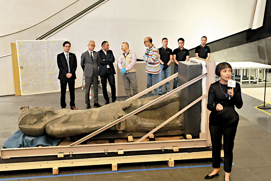 在埃及駐香港及澳門總領事館副總領事Anas Shadi、吳志華及香港故宮文化博物館副館長(研究策展、藏品及節目)王伊悠見證下,香港故宮文化博物館與埃及方的文保團隊昨日合力開箱三座巨型石像,包括法老麥倫普塔的邁步像(第19王朝,麥倫普塔統治時期,約公元前1213年至公元前1203年在位)、阿蒙神妻謝佩努彼特二世邁步像(第25王朝,約公元前747年至公元前656年)及伊烏尼特坐像(第18王朝,約公元前1550年至公元前1295年)。