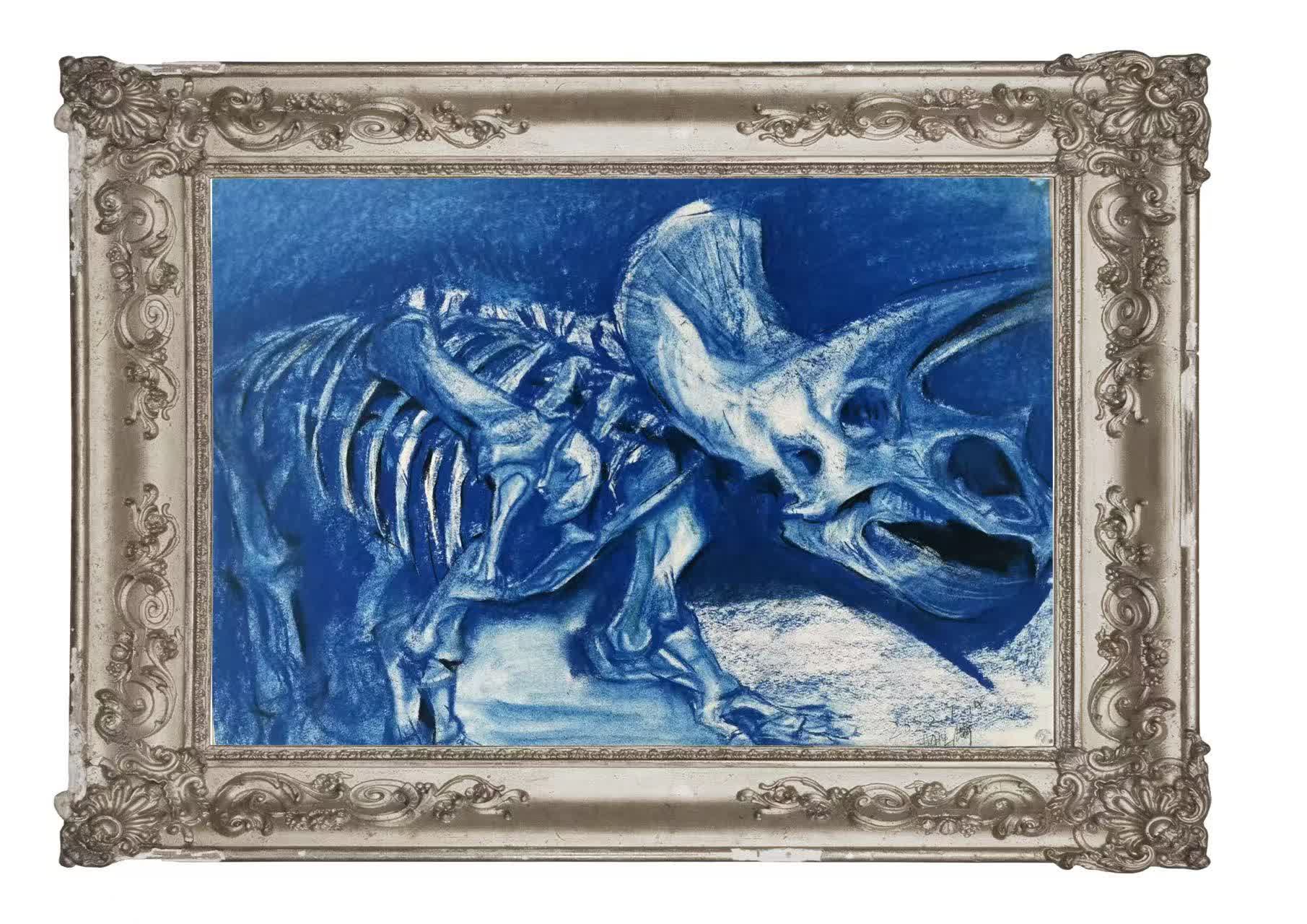 在藝術表達上,他選擇以碳粉為創作媒介,用手指、棉簽替代畫筆,通過「淡粉鋪通透、濃粉疊厚重、細粉勾紋路」的技法,讓恐龍骨骼既有科學的精準,又兼具「歲月沉澱的溫度」。而所有科學與藝術的表達,最終都指向「生態關切」的核心:以恐龍從繁盛到滅絕的命運,隱喻地球生態的脆弱性,呼籲世人守護地球生命共同體,恰與UWEE盧浮宮國際藝術展「同一個世界·同一個未來」(One World, One Future)的主題形成深度呼應。