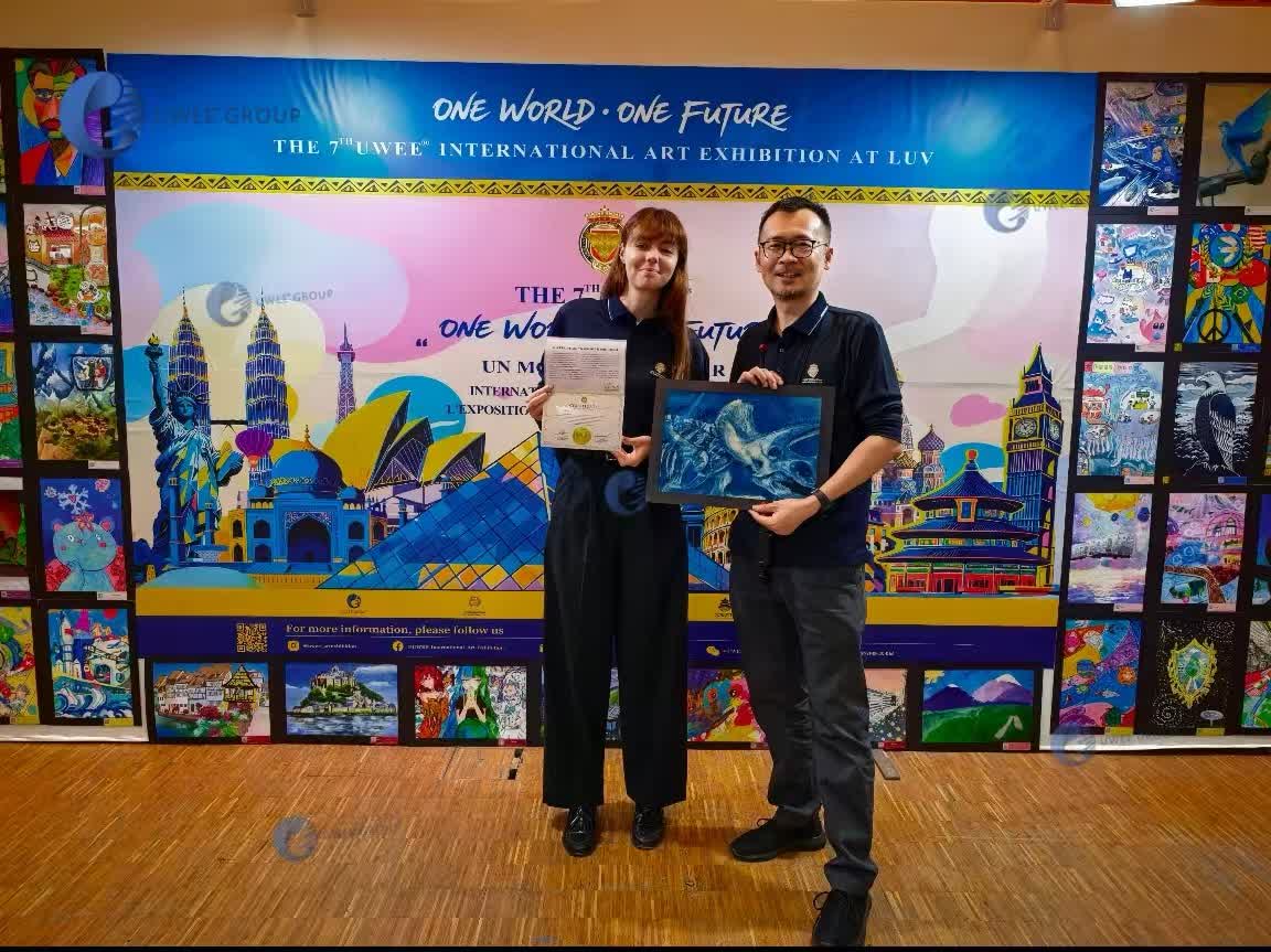 據悉,第七屆UWEE盧浮宮國際藝術展匯集了來自中國、法國、意大利、英國、德國、俄羅斯、巴西、哈薩克斯坦、美國、白俄羅斯、馬來西亞、韓國、新西蘭、黑山等全球八十餘個國家和地區的千餘件優秀作品。展覽作品涵蓋從兒童到職業藝術家的創作,兒童作品以純真視角展現對和平、科技與未來的想像,青年藝術家、職業畫家及美術教師的作品則傳遞出對人類命運的深刻思考。