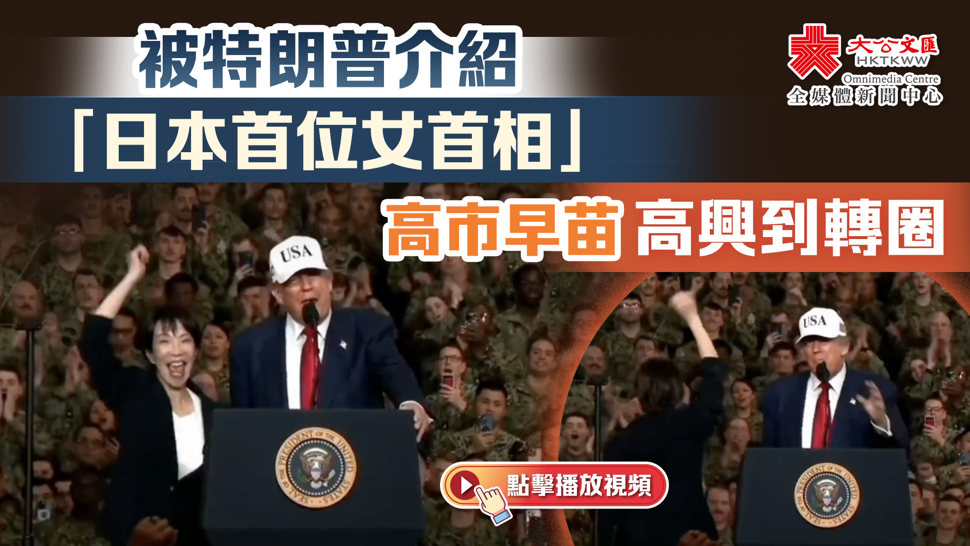 10月28日,在橫須賀的美國「華盛頓」號航母上,特朗普向台下美軍士兵介紹說,「這個女人是一位贏家……她是日本歷史上第一位女首相。」旁邊的高市早苗激動地跳了起來。