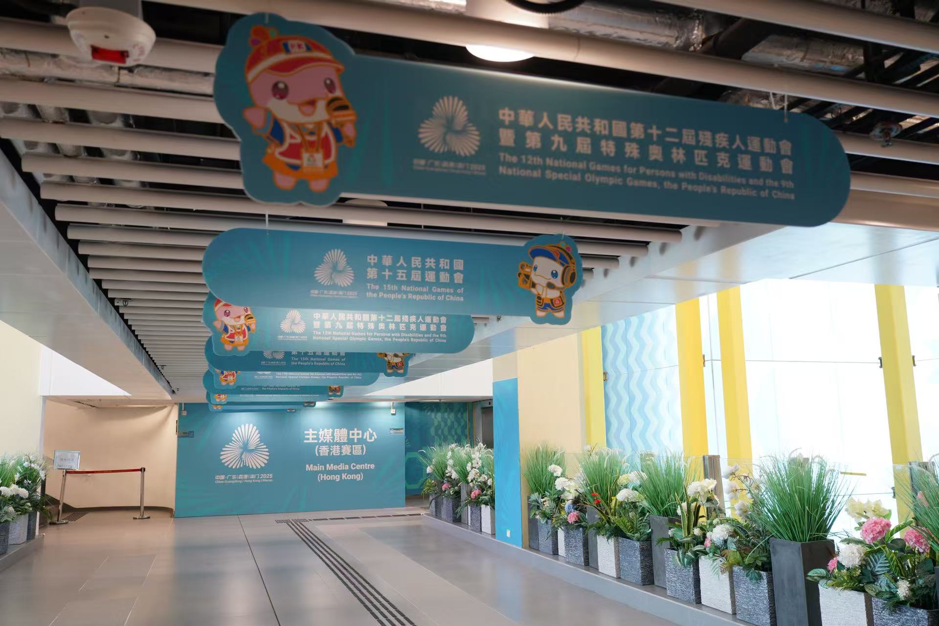 今次賽事主媒體中心內設主新聞中心與國際廣播中心。主新聞中心為註冊媒體和轉播機構提供工作區、採訪區、新聞發布廳及各項設備,並播放賽事實況和提供即時比賽成績與賽事信息。國際廣播中心作為十五運會和殘特奧會的廣播總控制室,由十五運會主廣播機構中央電視台匯總粵港澳所有賽場的公用訊號,再發放予本港四家獲授權媒體,即香港三間免費電視台和香港電台,在本地免費播放十五運會的賽事。