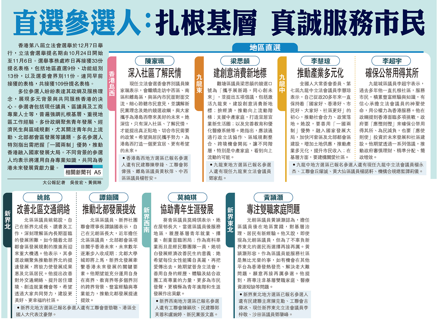 多位參選人紛紛表達其政綱及服務理念,展現多元背景與共同服務香港的決心。參選者包括現任議員、區議員及工商專業人士等,普遍強調扎根基層、重視地區工作經驗。多份政綱聚焦青年發展、經濟民生與區域規劃,尤其關注青年向上流動、北部都會區發展等議題。多名參選人特別指出需把握「一國兩制」優勢,推動香港融入國家發展大局。不同背景的參選人均表示將運用自身專業知識,共同為香港未來發展貢獻力量。