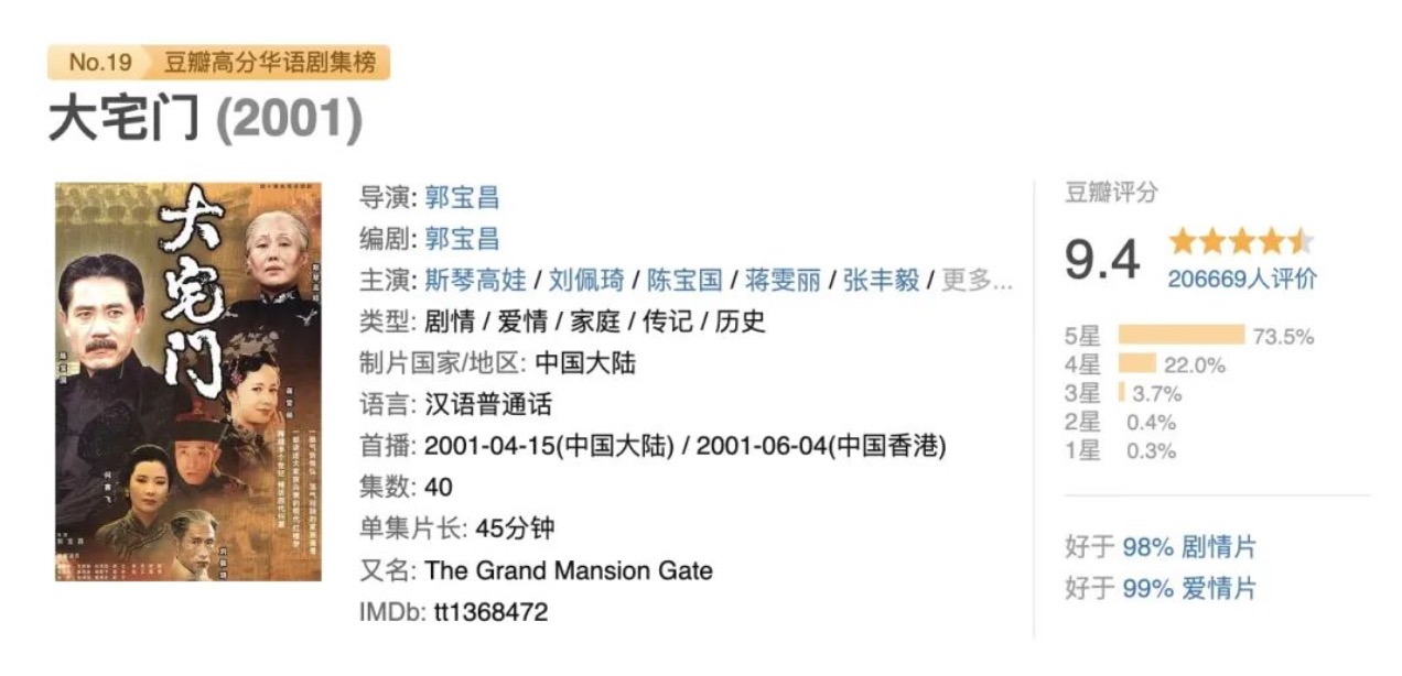 2001年,72集電視劇《大宅門》橫空出世,豆瓣評分高達9.4分,被譽為「年代劇天花板」。它以恢弘的體量,描繪出白府家族的百年風雲,寫盡家族興衰、世事沉浮與人情冷暖,掀起全民追劇熱潮,成為一代觀眾難忘的熒屏經典。