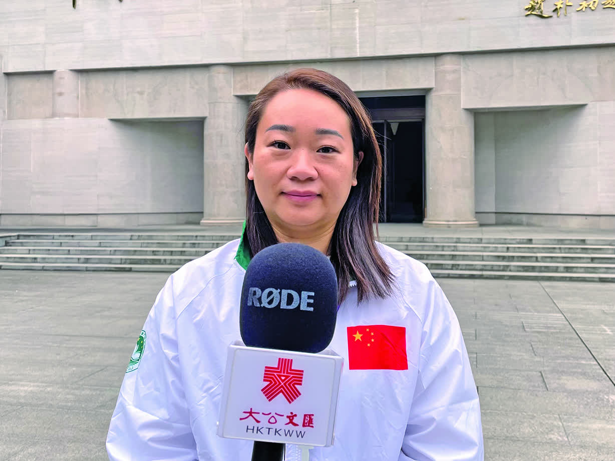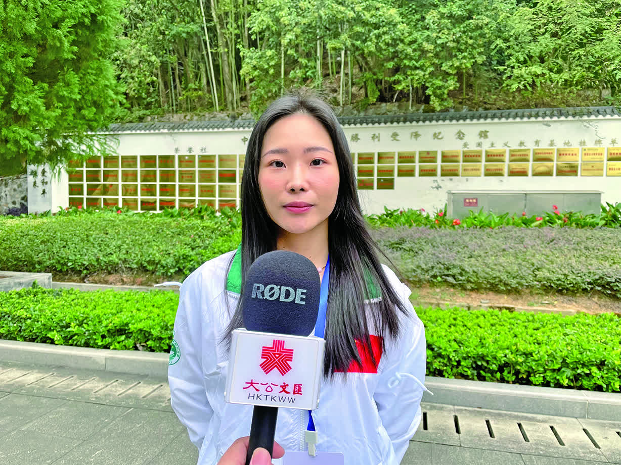 團員徐雅琳的爺爺是一名軍人,在爺爺的熏陶下,她從小對抗戰歷史有深刻的認識。她提到,參訪過程看到日本投降與中華民族偉大勝利的歷史畫面,內心深受觸動,希望能延續爺爺報效祖國之心,傳承好愛國愛澳精神,為國家的繁榮穩定貢獻力量。