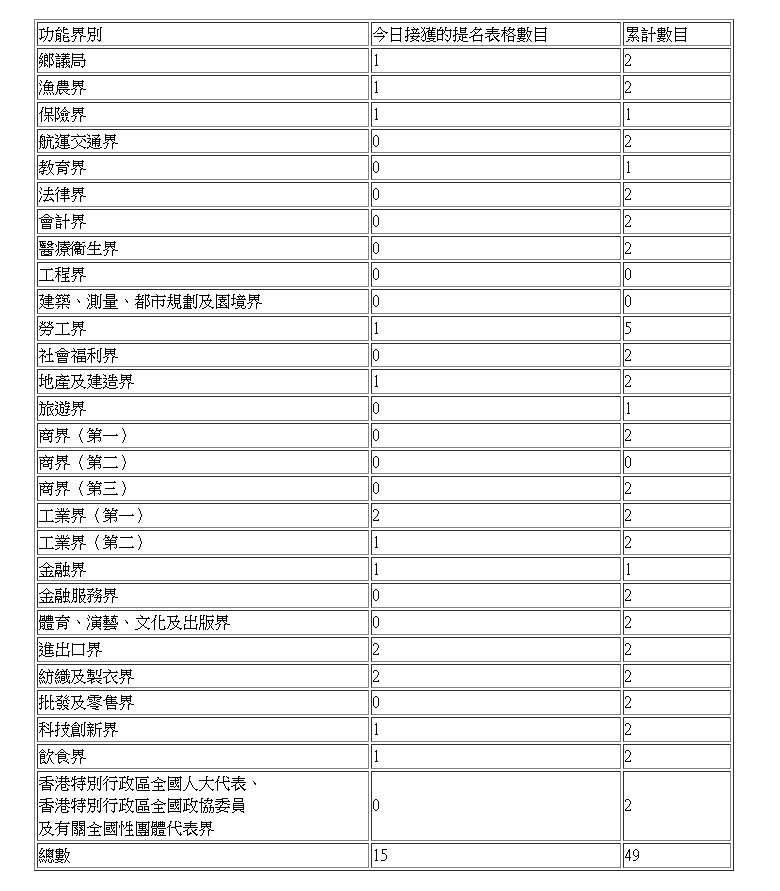 選舉委員會界別今日接獲的提名表格數目為8份,至今累計數目為39份。