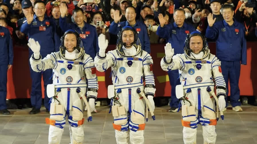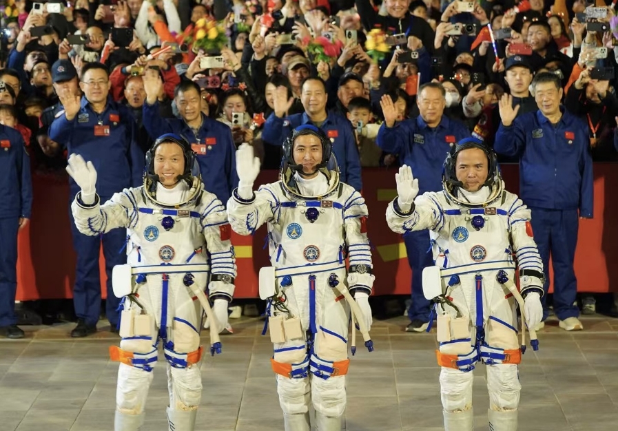 20時49分,張陸、武飛、張洪章3名航天員領命出征。空間站應用與發展階段飛行任務總指揮部有關成員以及航天科技人員、各族群眾代表在現場為航天員乘組壯行。