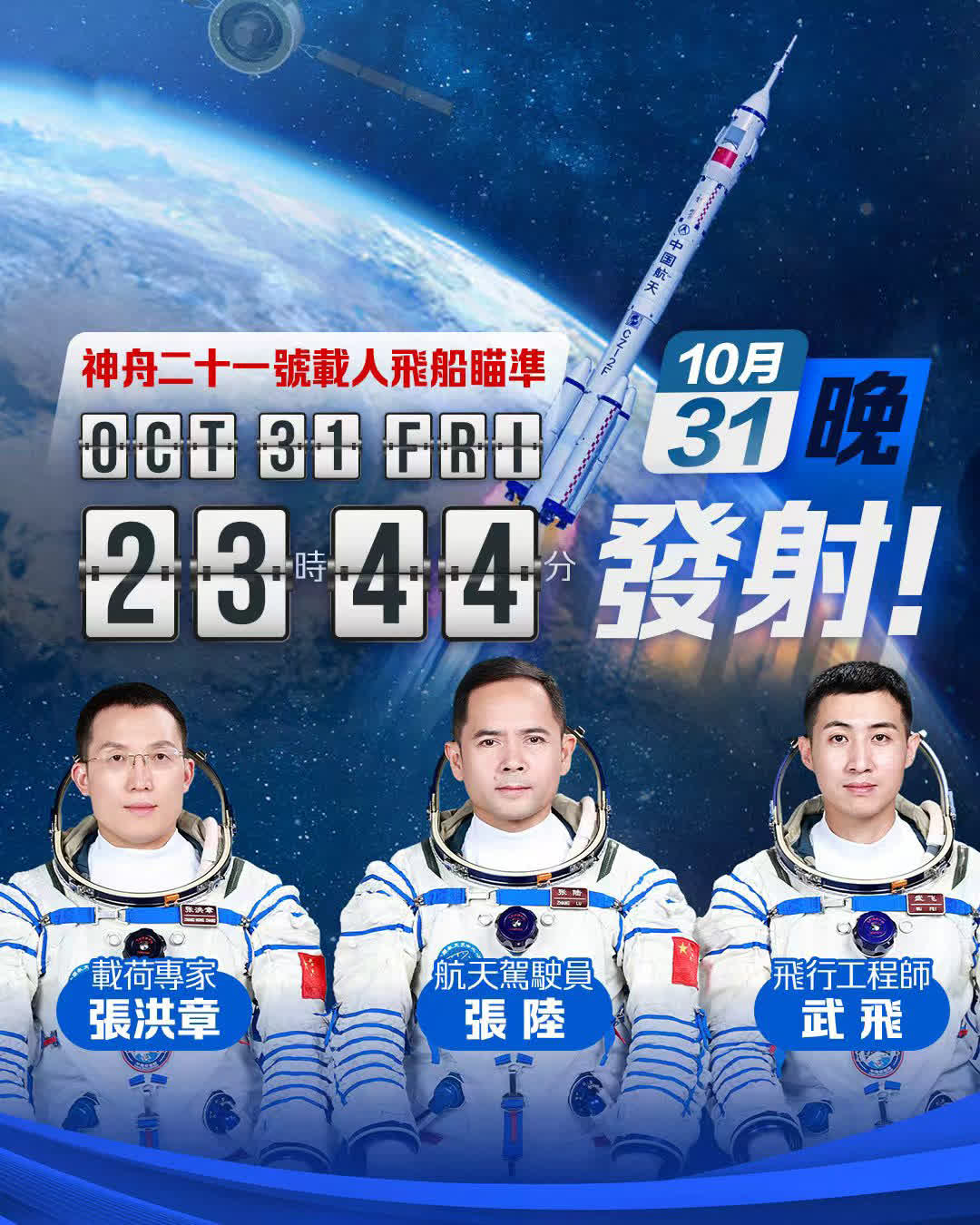 大公文匯全媒體報道,神舟二十一號載人飛行任務瞄準北京時間10月31日23時44分發射。執行神舟二十一號載人飛行任務的航天員乘組由張陸、武飛、張洪章組成,張陸擔任指令長,他們在軌期間將開啟為期半年的天宮空間站之旅,將新開展27項科學與應用項目,並首次在太空飼養4隻小鼠。
