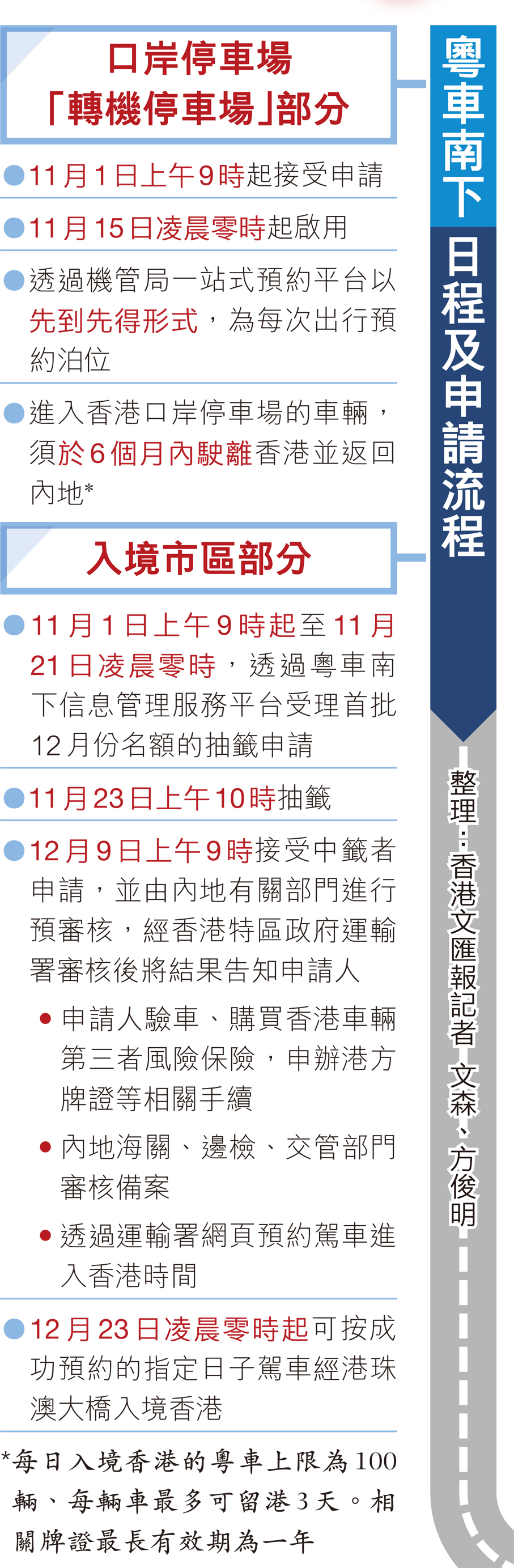 (香港文匯報記者 文森、方俊明)香港特區政府、廣東省公安廳、廣東省交通運輸廳昨日同步公布粵車南下的實施安排。兩地政府同意口岸停車場的「轉機停車場」於今日(1日)上午9時起接受申請,並於本月15日凌晨零時起啟用;入境市區部分亦由今日起接受首輪抽籤報名,中籤者可於下月9日起提交申請,以期於同月23日凌晨零時起按成功預約的指定日子駕車經港珠澳大橋入境香港。為確保有序實施,粵車南下首批先開放廣州、珠海、江門及中山4個城市,半年後推廣到全省其他地市。為做好總量管控及提供更好的出行體驗,兩地政府同意初期每日入境香港的粵車上限為100輛、每輛車最多可留港3天。