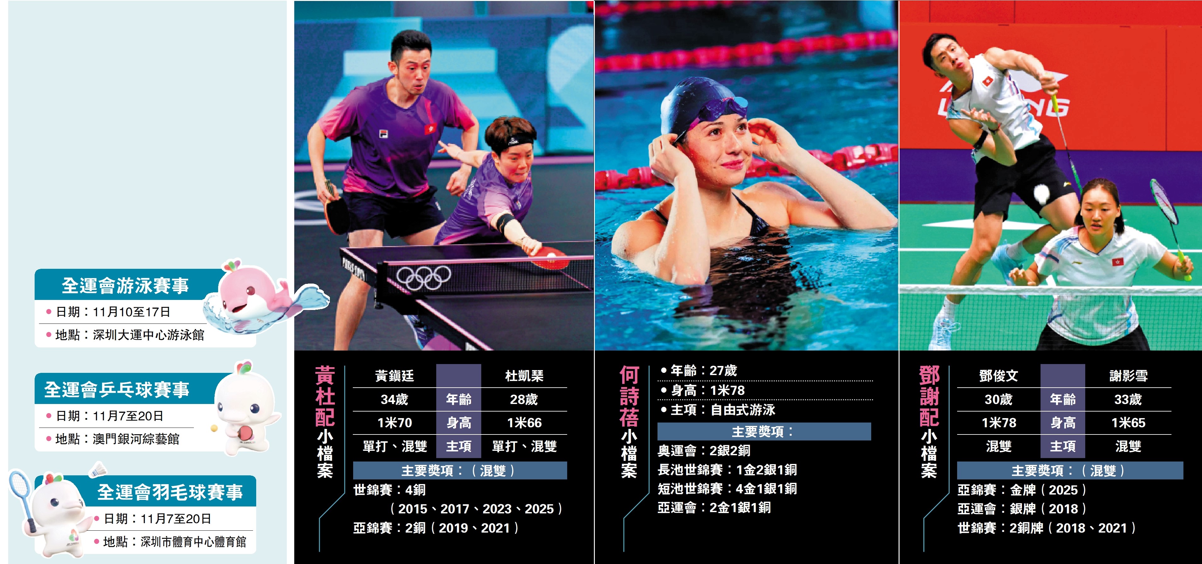 何詩蓓多年來征戰無數不同大小規模國際賽,去年巴黎奧運她亦繼東京奧運後再度踏上奧運頒獎台,分別奪得女子100米和200米自由泳銅牌,個人在奧運會累積2銀2銅,成為歷來獲獎牌最多的本港運動員。首度參與全運會的何詩蓓,今屆已確定出戰強項100米、200米自由泳,以及50米自由泳和蛙泳,而為確保最佳狀態參賽,她甚至放棄參加今夏游泳世錦賽,就是要專心養傷出戰全運。