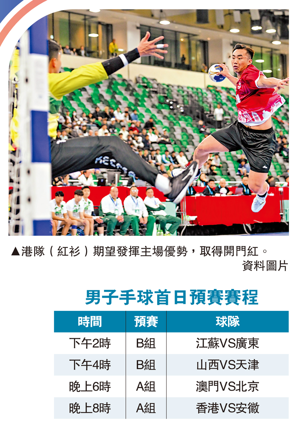 全運男子手球將在今天分別舉行4場A、B組的小組賽,首場揭幕戰下午2時由江蘇隊對陣廣東隊,緊接的下午4時山西隊鬥天津隊。至於晚上6時則上演澳門隊與北京隊,晚上8時尾場賽事則由港隊「壓軸出場」對陣安徽隊。