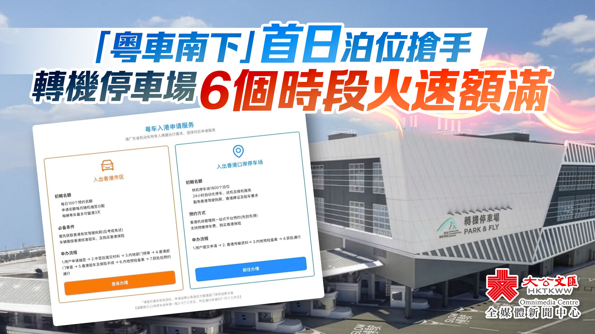 大公文匯全媒體報道,「粵車南下」實施細則昨日(10月31日)出爐,機管局今日(11月1日)早上9時起接受廣東私家車車主預約機場停車泊位申請,本月15日啟用。截止今午12時許,機管局自動化停車場網上預約平台顯示,啟用首日6個時段的泊車轉機名額已滿。
