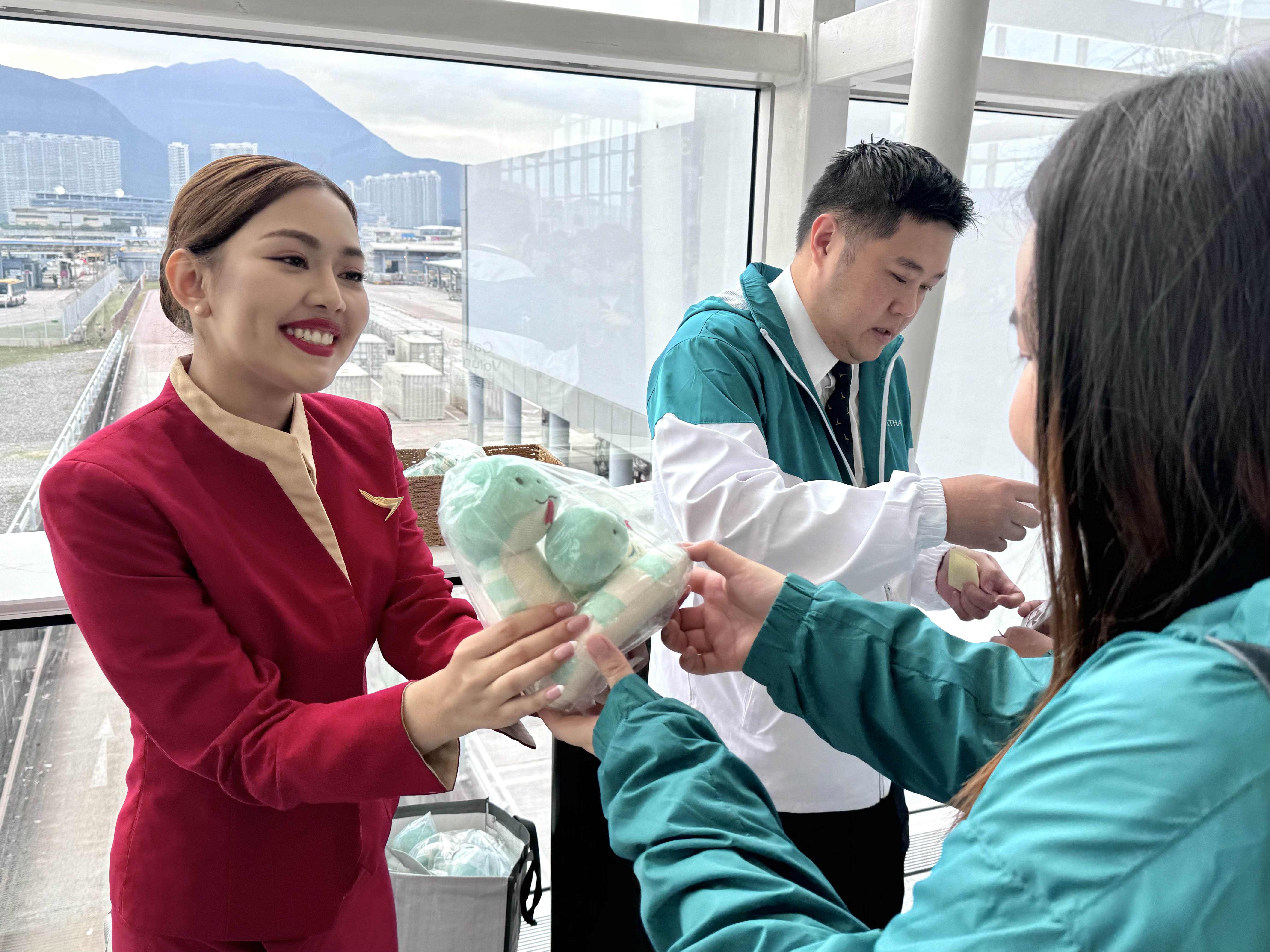 在活動期間,學員們可以通過參與問答遊戲獲得貼紙,隨後兌換玩偶等獎品。有趣的互動環節吸引學員們踴躍參與,同時參與者亦能從中汲取實用的航空知識。而在「空中之旅」途中,陳國基和劉凱詩亦給學員們派發紀念禮品,眾人一同度過了90分鐘愉悅且難忘的旅程。