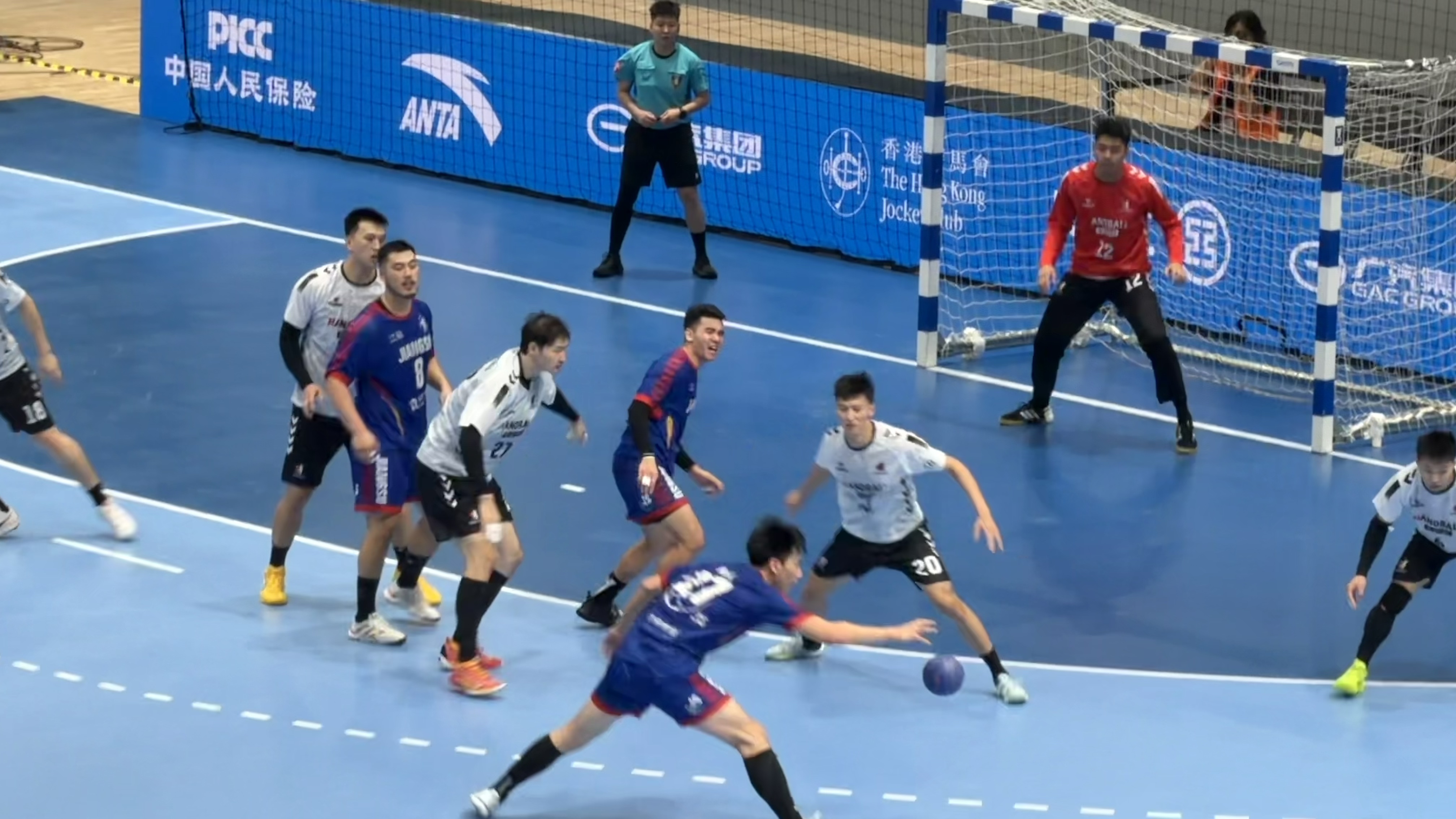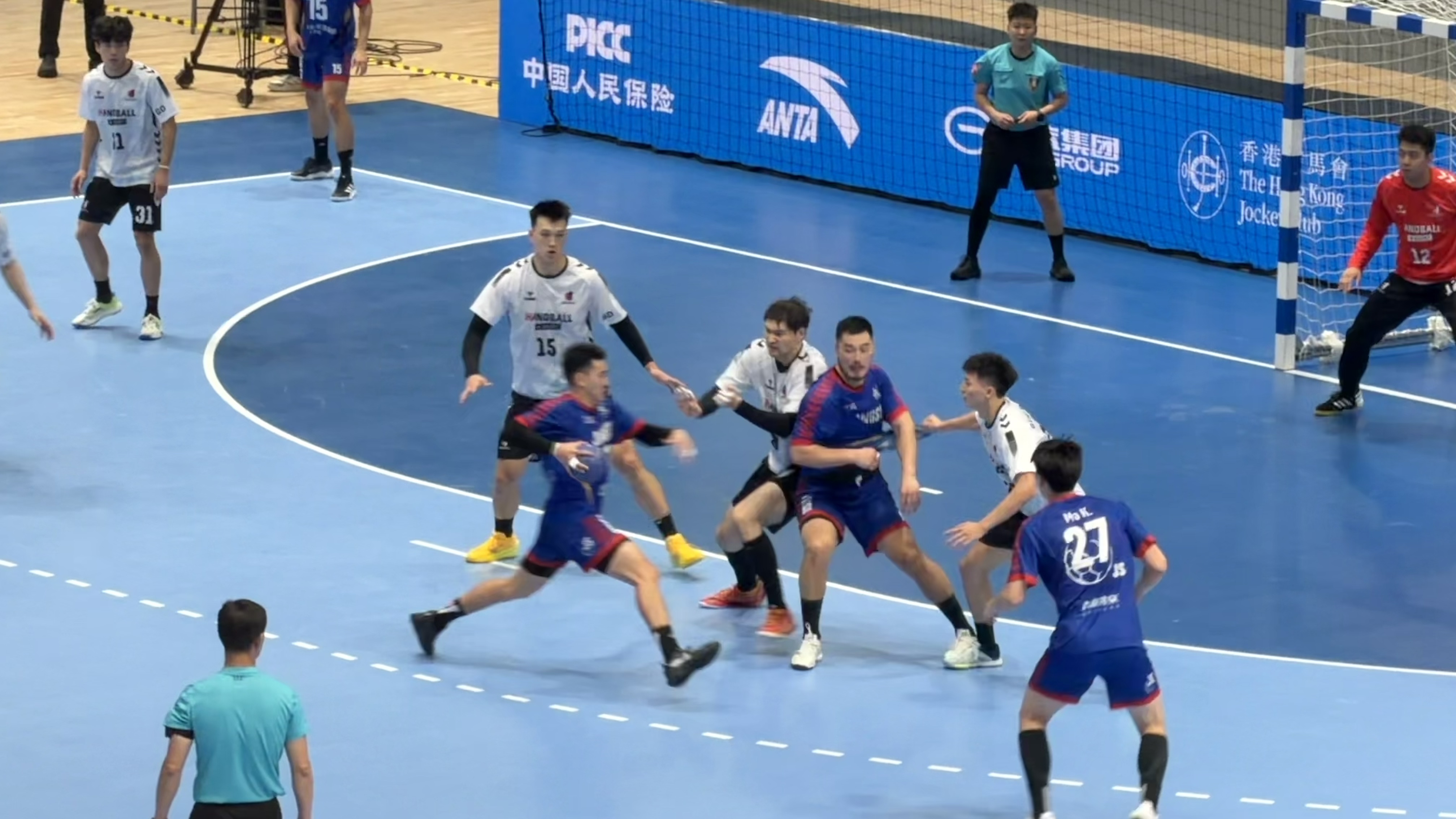現場賽況十分激烈,廣東隊在開場暫時領先,上半場進行一半時,江蘇隊8號射門得分,將比分追平至6:6;22分時,廣東隊22號罰球得分;24分時江蘇隊9號射門得分,比分變為8:9;隨即廣東隊在上半場內分別進球3次,江蘇隊則進球2次。半場結束時,雙方比分為10:12,廣東隊暫時保持領先優勢。