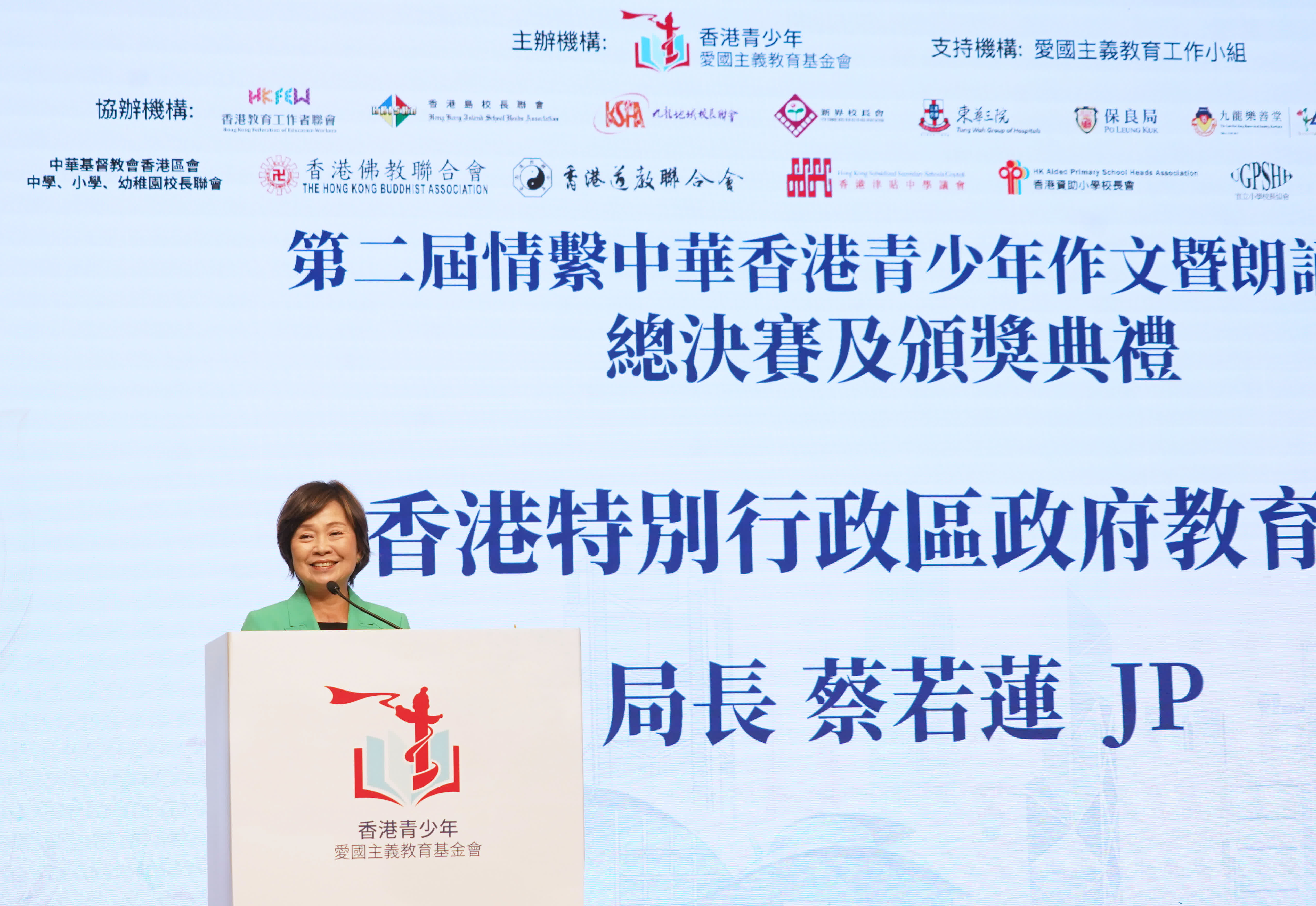 (香港文匯報記者 楊梓穎)今年適逢中國人民抗日戰爭暨世界反法西斯戰爭勝利80周年以及香港回歸祖國28周年,為深化香港青少年對國家與民族歷史的認知,厚植家國情懷,「香港青少年愛國主義教育基金會」舉辦第二屆情繫中華香港青少年作文暨朗誦大賽」,今日舉行總決賽及頒獎典禮,教育局局長蔡若蓮出席活動並致辭。本屆比賽以「回歸」與「抗戰勝利」為主題,旨在鼓勵同學透過比賽提升寫作與朗誦水平,同時增強國民身份認同,培養正面價值觀與態度。香港青少年愛國主義教育基金會會長譚錦球表示,希望藉此引導同學探索歷史事件,加深對國家及香港政治進程發展的了解與認同。
