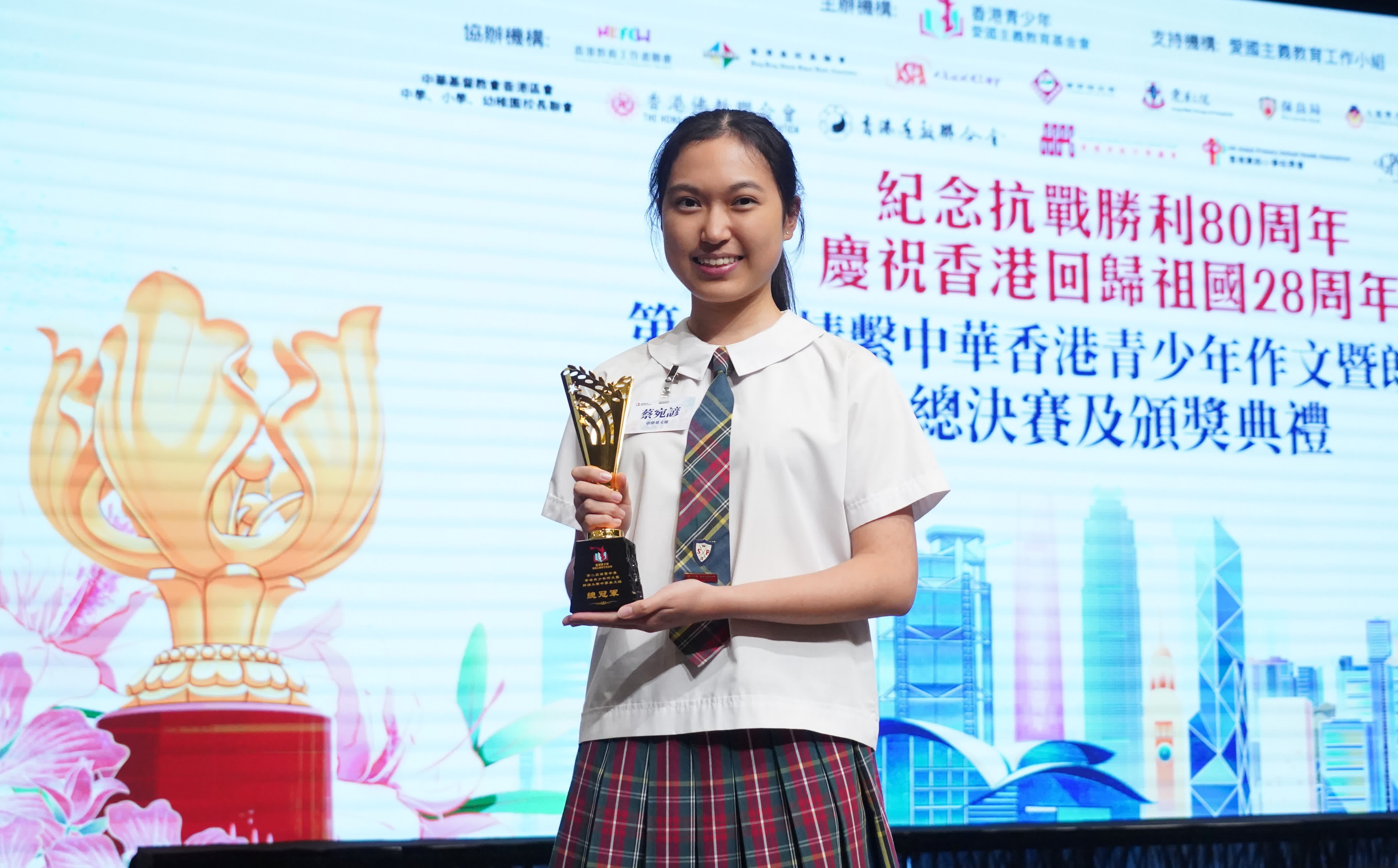 聖保祿學校(中學部)的蔡宛諺獲中學英文組總冠軍。她說,這次以英文詮釋愛國主題是一項全新挑戰,透過重溫香港回歸的歷史影像和搜集相關資料,深刻體會到祖國與香港之間的緊密聯繫。
