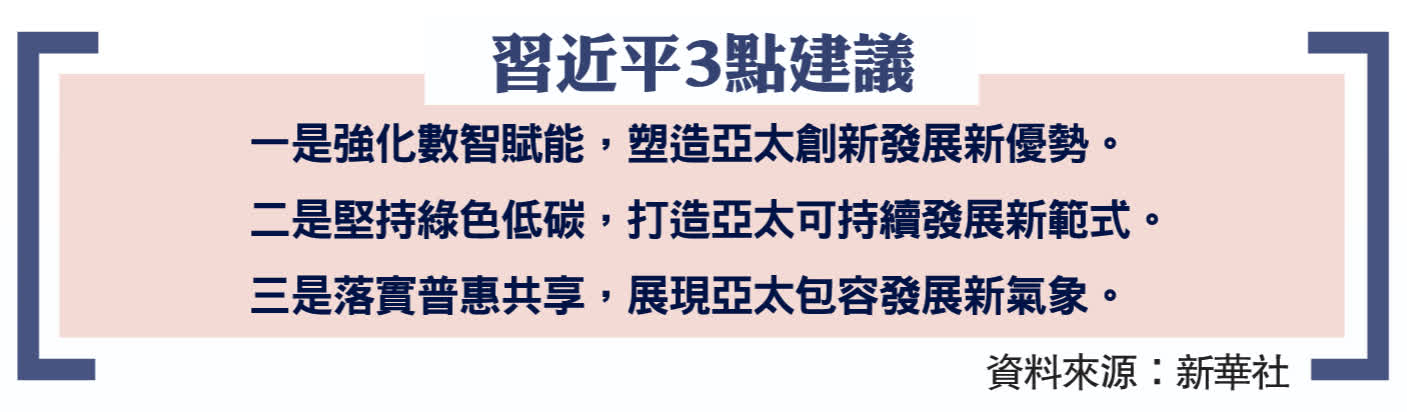 習近平指出,當前,新一輪科技革命和產業變革深入發展,為人類社會開闢了新前景。同時,世界經濟增長動能不足,全球發展赤字擴大,氣候變化、糧食和能源安全等挑戰加劇。亞太各經濟體應該加強互利合作,把握新機遇,應對新挑戰,共同開創可持續的美好明天。