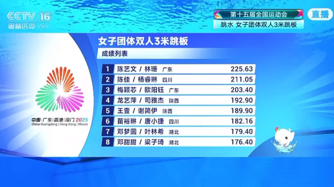 在女子團體雙人3米跳板比賽中,廣東隊憑藉奧運冠軍陳藝文和世界冠軍搭檔林珊的出色發揮,暫居第一位。