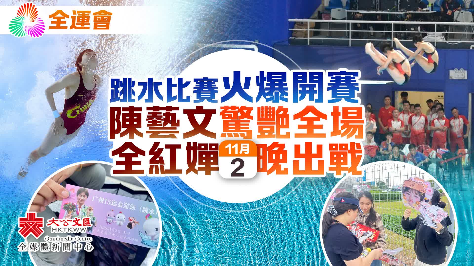 (大公文匯全媒體 記者敖敏輝、實習記者黃靖容)今日(11月2日),十五運會跳水項目在位於廣州市天河區的廣東奧體中心游泳跳水館開賽,首日進行女子團體的較量,奧運冠軍全紅嬋、陳藝文、陳芋汐將陸續出戰,當晚將產生本屆全運會第一枚跳水金牌。上午舉行的女子團體雙人3米板中,廣東隊陳藝文率先出戰,引爆全場。