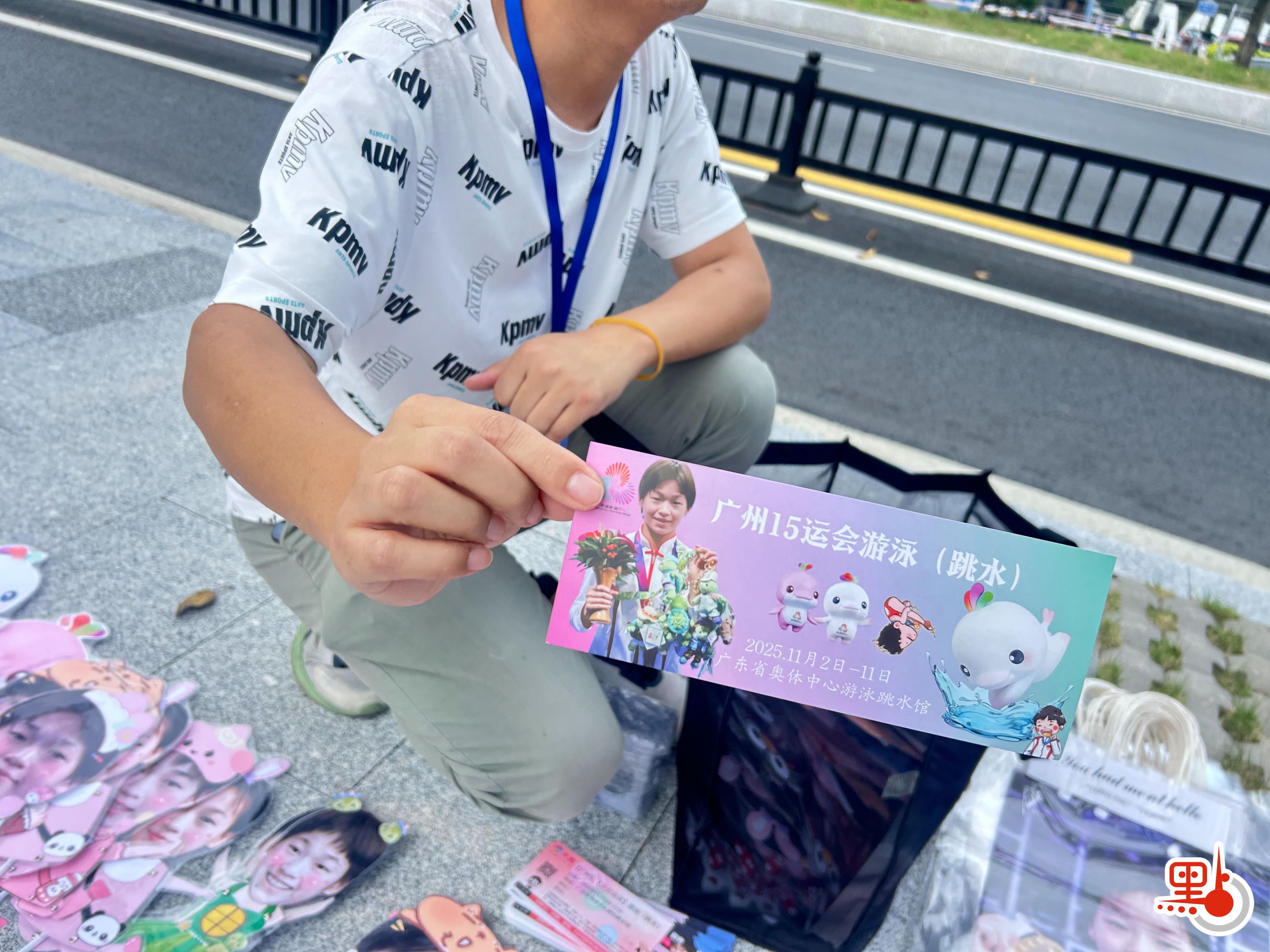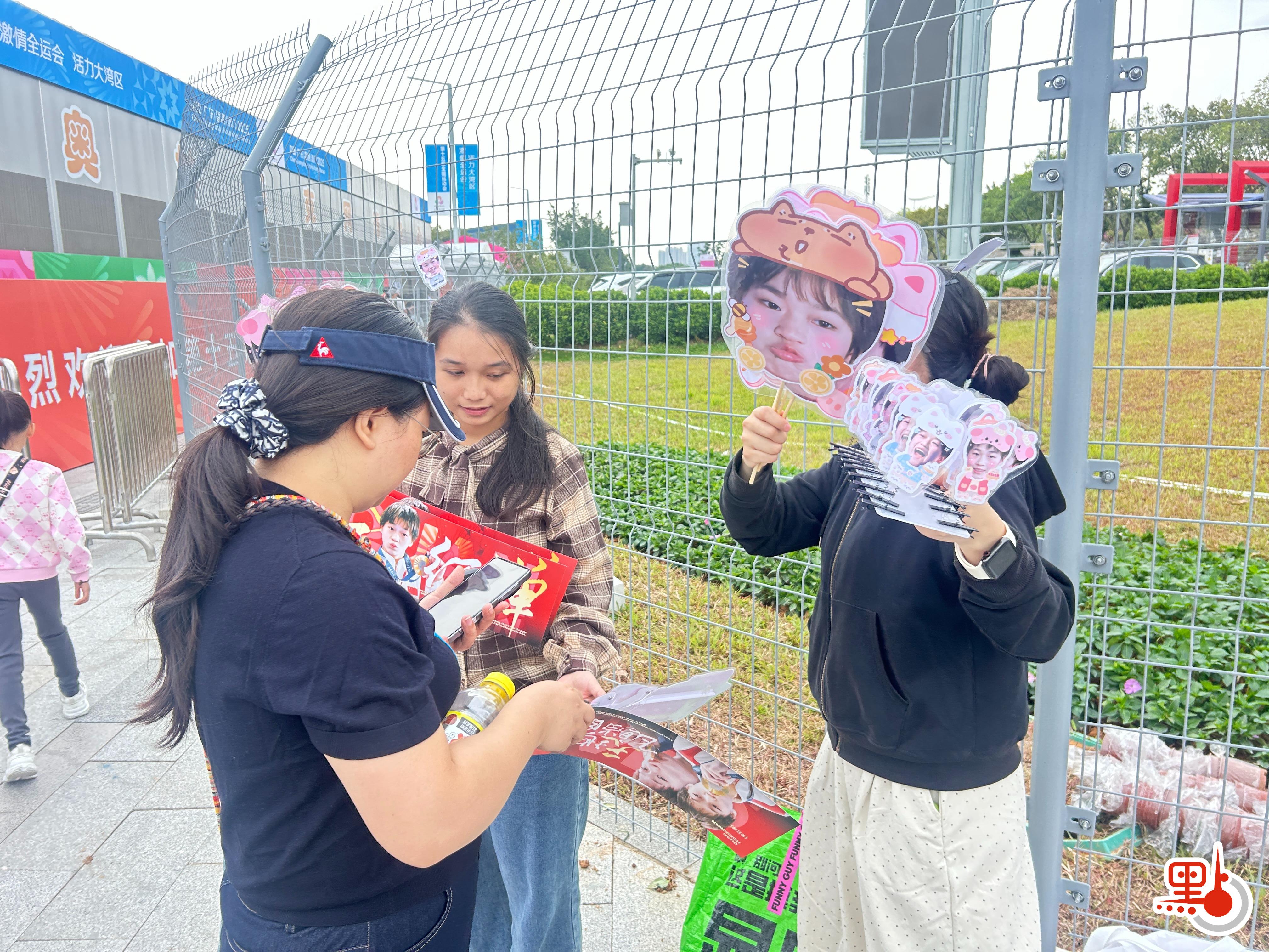 記者看到,比賽周邊有不少小商販,製作了印有全紅嬋照片、名字的創意條幅和文創產品,不時有觀眾前來購買。