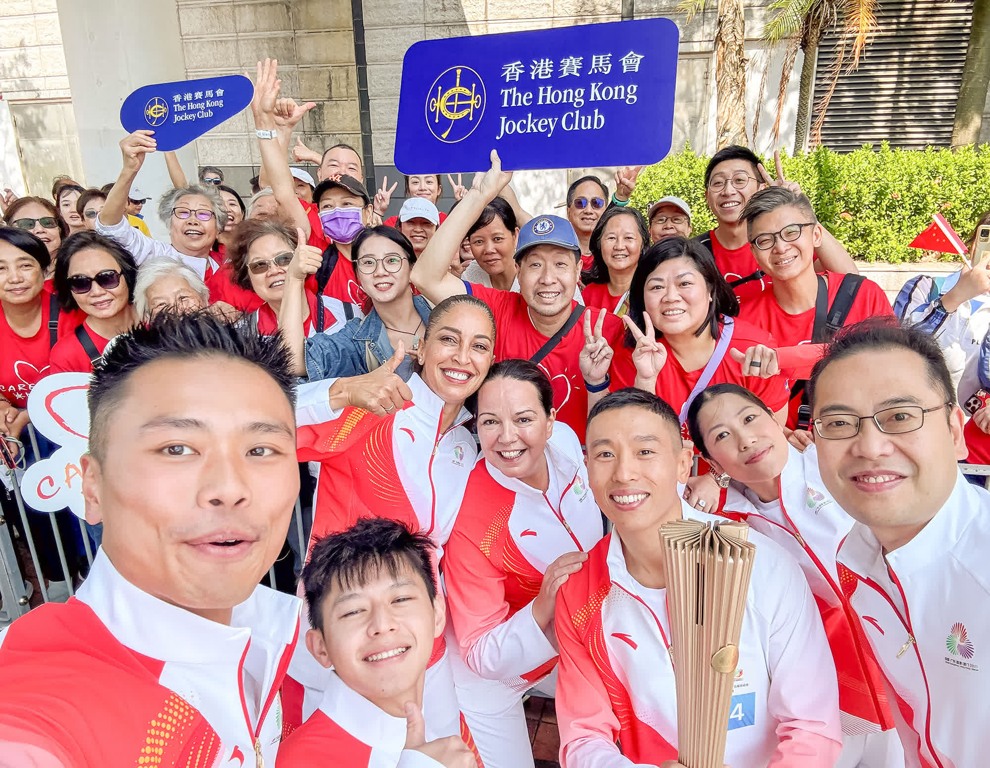 值得一提,香港段其中兩棒由多名火炬手組成的方陣傳遞。馬會負責組成其中一個方陣,在尖沙咀路段傳遞聖火。組成方陣的成員有首位勝出浪琴國際騎師錦標賽的本地培育騎師何澤堯,以及六位來自馬會不同部門的員工,部分更是退役運動員,包括:馬術事務部的龐雅雯、賽馬市場部的盛雅佩(曾為法國國家田徑隊成員)、足球博彩事務部的羅達明、公司保安部的何嘉楠、慈善事務部的何宇軒(曾為香港賽艇運動員),以及馬會見習騎師學員黎彥麟。他們的參與凸顯馬會的多元文化,從各方面致力建設更美好社會。