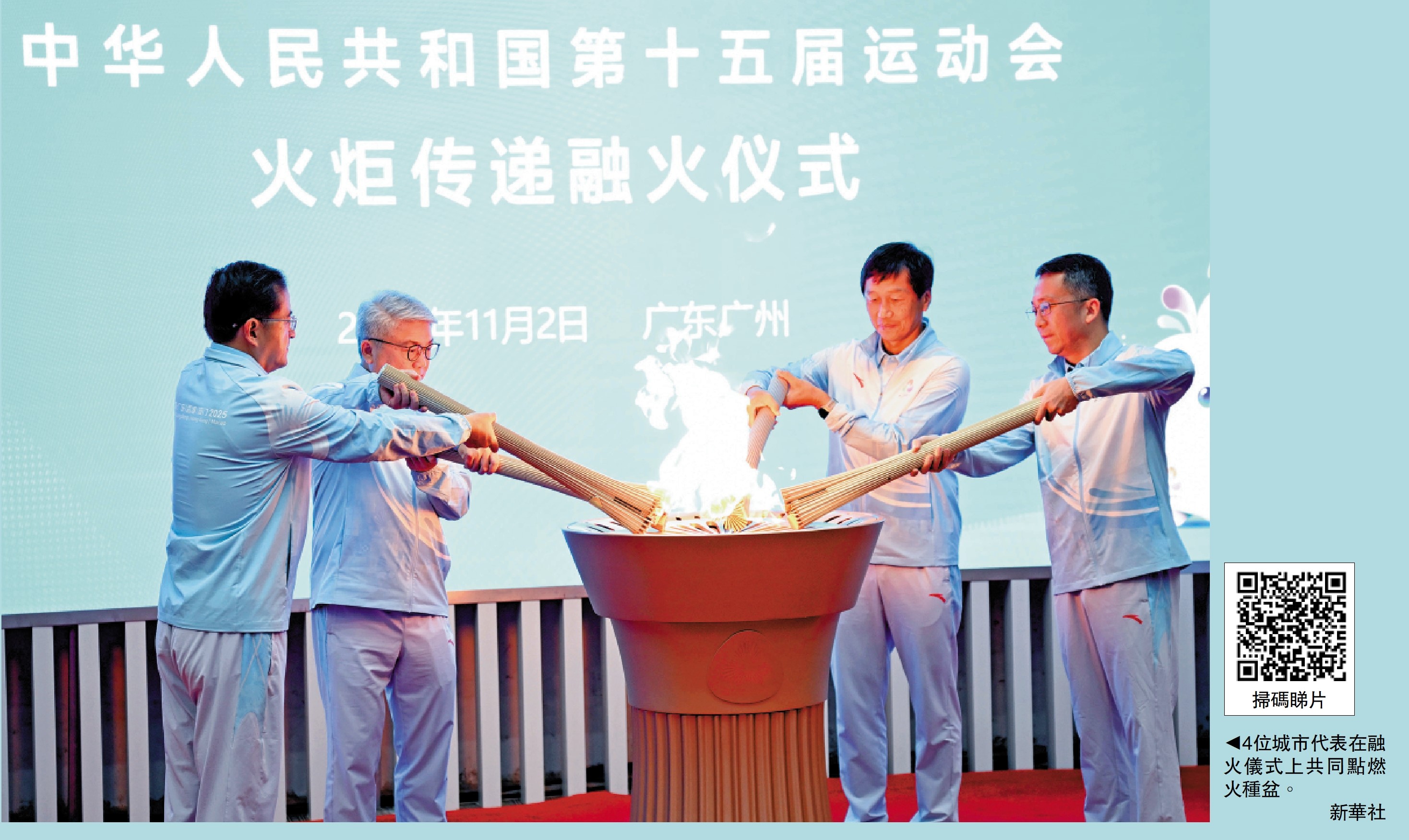 在香港站火炬傳遞儀式上,香港乒乓球名將黃鎮廷、劍擊好手佘繕妡等50名火炬手,在市民的歡呼聲、打氣聲中傳遞榮耀。火炬傳遞結束後,四城火種於昨午匯聚廣州,在廣東奧林匹克體育中心舉行融火儀式,為11月9日晚開幕式主火炬點燃做準備。