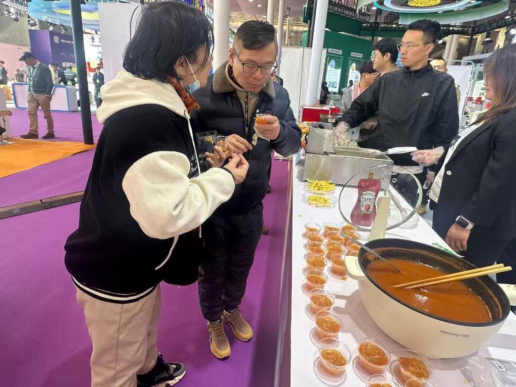 在加工產品展區,澱粉、全粉、薯條、薯片、薯泥、馬鈴薯月餅、酸奶餅、馬鈴薯醋等琳琅滿目的精深加工產品,全面呈現烏蘭察布馬鈴薯從田間到餐桌的全鏈轉化能力。特別是「原味烏蘭察布」區域公用品牌旗下的「薯都薯」「嘟嘟薯」法式低溫油浴系列產品,以健康、低脂、零添加為特色,生動詮釋「原滋、原香、原生態」的品牌理念,贏得荷蘭、法國、哈薩克斯坦、埃及、伊朗等多國採購商的高度評價。他們紛紛稱讚:「烏蘭察布馬鈴薯『原料優質、工藝精湛、口感出眾!』」。哈薩克斯坦客商阿拜·庫南巴耶夫表示,將積極對接烏蘭察布馬鈴薯種薯資源,並計劃引進薯條生產線,推動「烏蘭察布馬鈴薯」沿絲綢之路香飄中亞,走向世界。