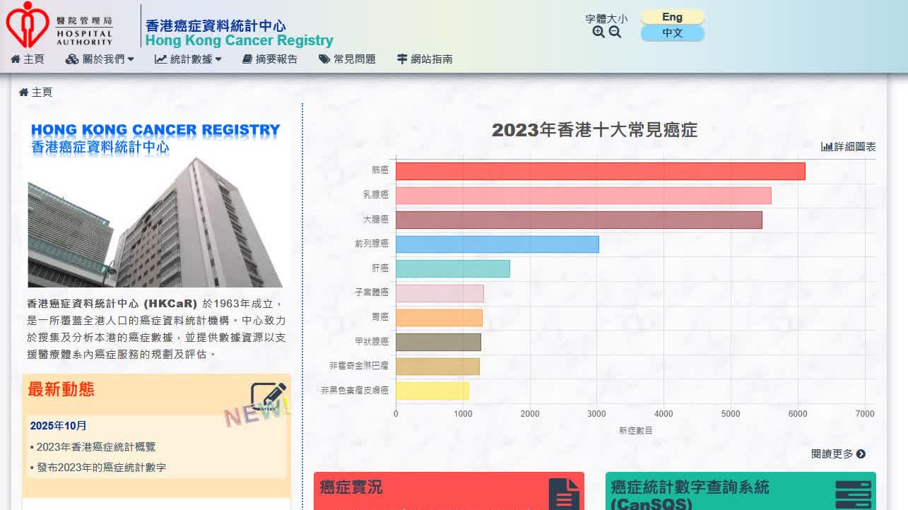 2023年整體癌症新症的人數中,女性佔19297宗,多過男性的18658宗。2023年香港有14867人因癌症離世,佔全港整體死亡人數26.2%。十大致命癌症中,肺癌排首位,其次是大腸癌和肝癌,排第四和第五分別就是胰臟癌和乳腺癌。