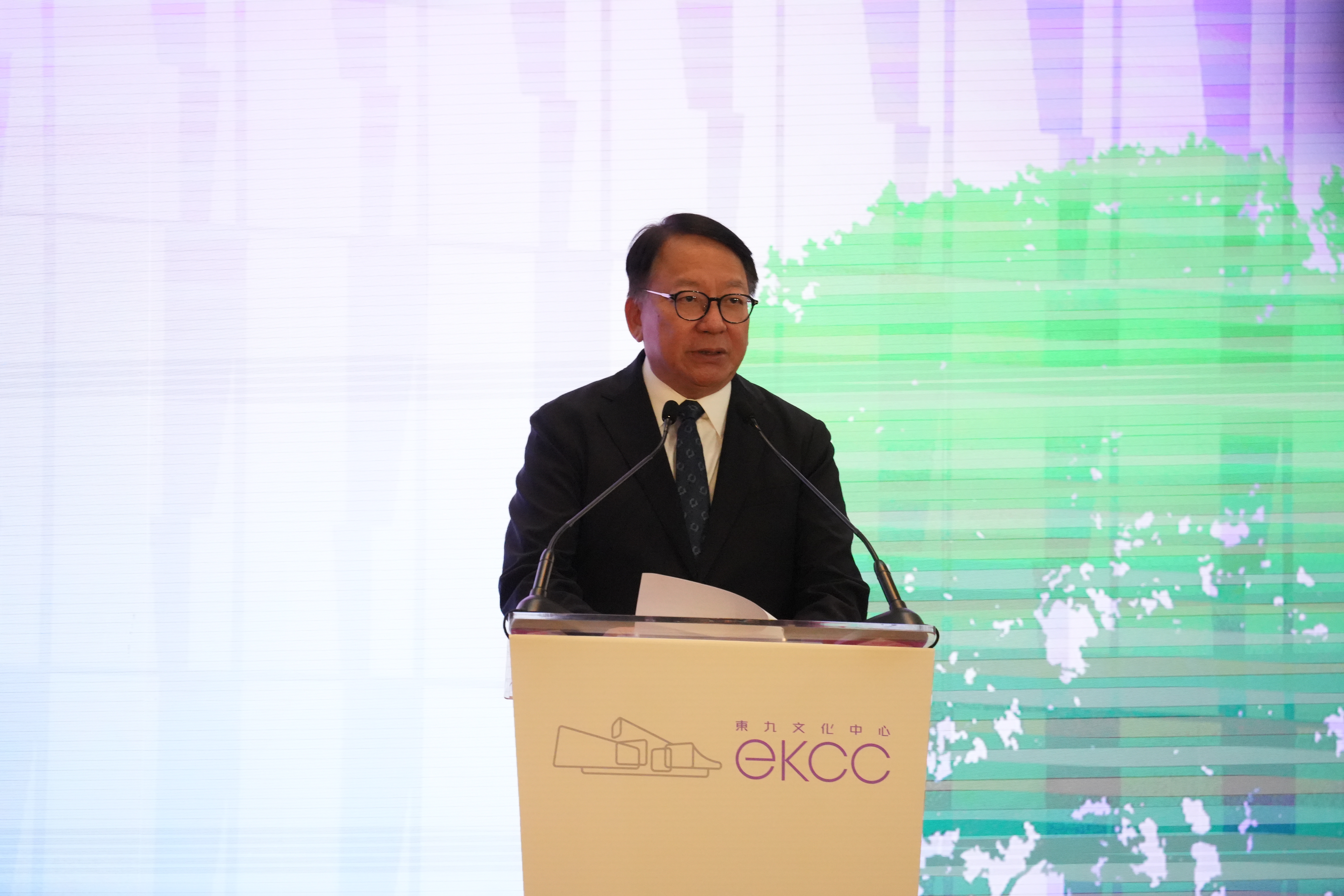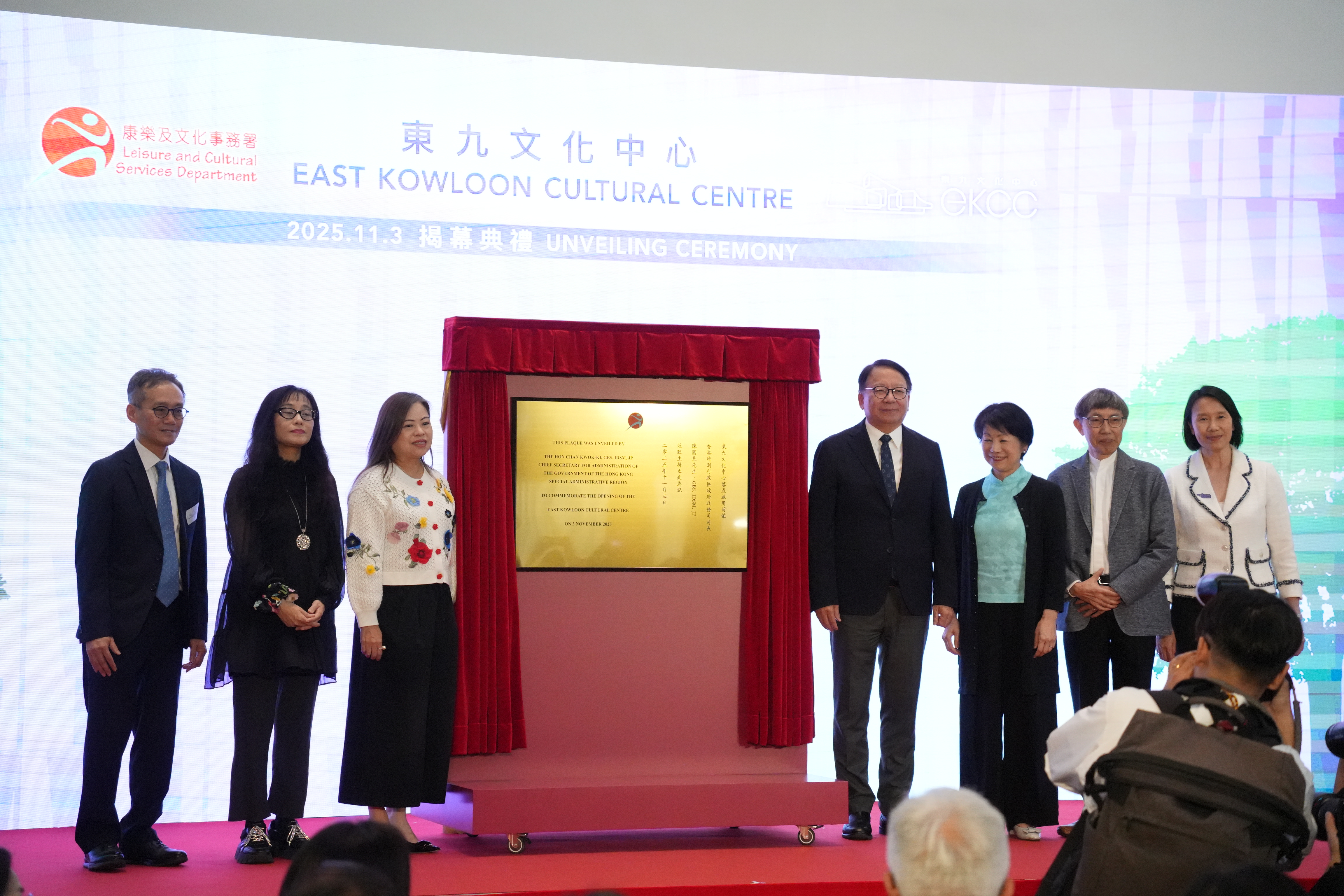 (大公文匯全媒體 記者 周傾芫)東九文化中心(EKCC)今日(3日)舉行揭幕典禮,政務司司長陳國基主禮。其他主禮嘉賓包括文化體育及旅遊局局長羅淑佩、文化體育及旅遊局常任秘書長沈鳳君、康樂及文化事務署署長陳詠雯、建築署副署長冼國良,以及開幕節目原創粵語音樂劇《一束光-高錕的記憶》的導演和編劇李敏。