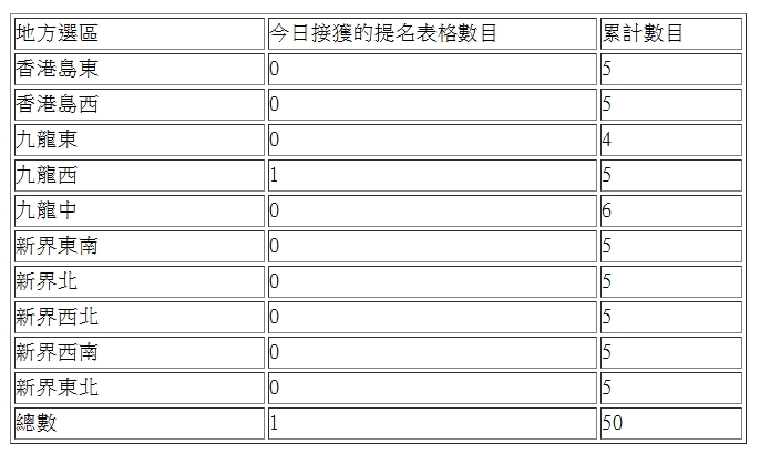 選舉委員會界別今日接獲的提名表格數目為6份,至今累計數目為50份。