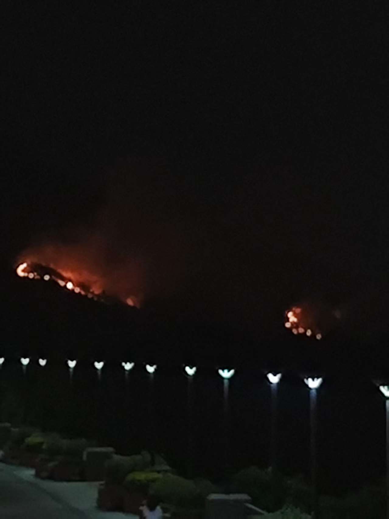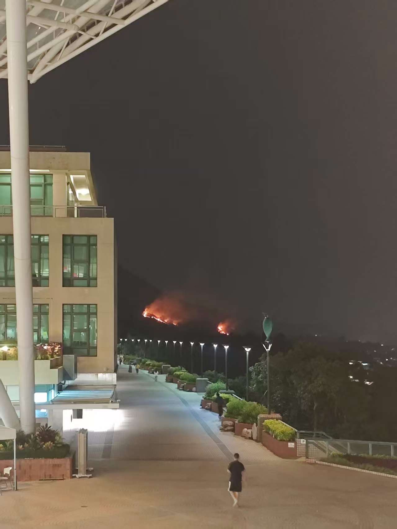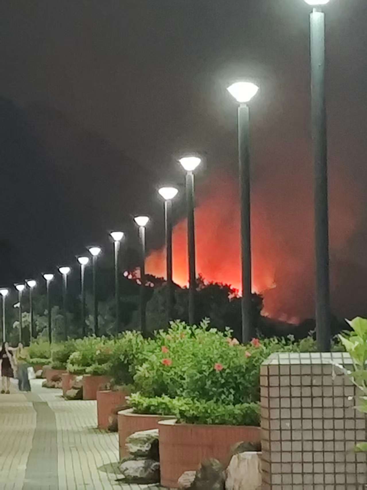 晚上約9時半,山火仍在焚燒。記者拍到長長「火龍」俯臥山頭,兩條約20米火線清晰可見。至10時,火勢照亮夜空,有讀者反映山火有增強趨勢。