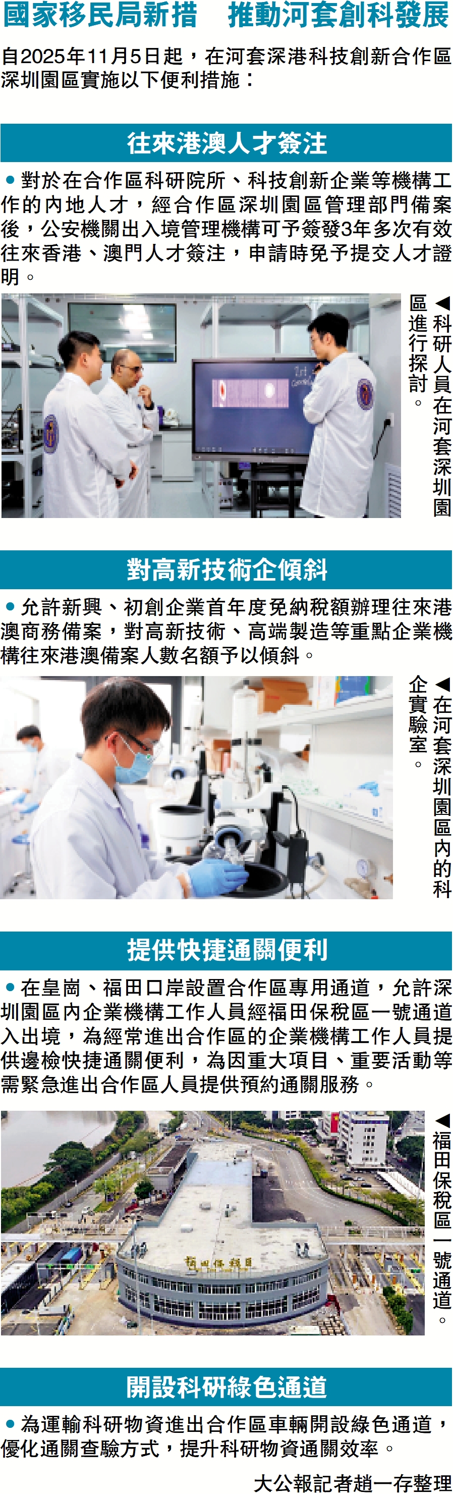 國家移民局5日發布的新政包括支持促進河套深港科技創新合作區深圳園區生產要素高效跨境流動。根據公告,自11月5日起,在河套深港科技創新合作區深圳園區,在皇崗、福田口岸設置合作區專用通道,允許深圳園區內企業機構工作人員經福田保稅區一號通道入出境,為經常進出合作區的企業機構工作人員提供邊檢快捷通關便利。36歲「新香港人」芯片博士王霄在接受訪問時表示,新政出台後,通關非常便利,距離縮短了,排隊的人也非常有序,人數不多,過程順暢流利。