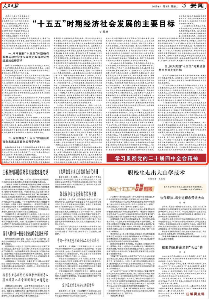 11月4日,《人民日報》要聞版刊發中共中央政治局常委、國務院副總理丁薛祥的署名文章,題為《「十五五」時期經濟社會發展的主要目標》。