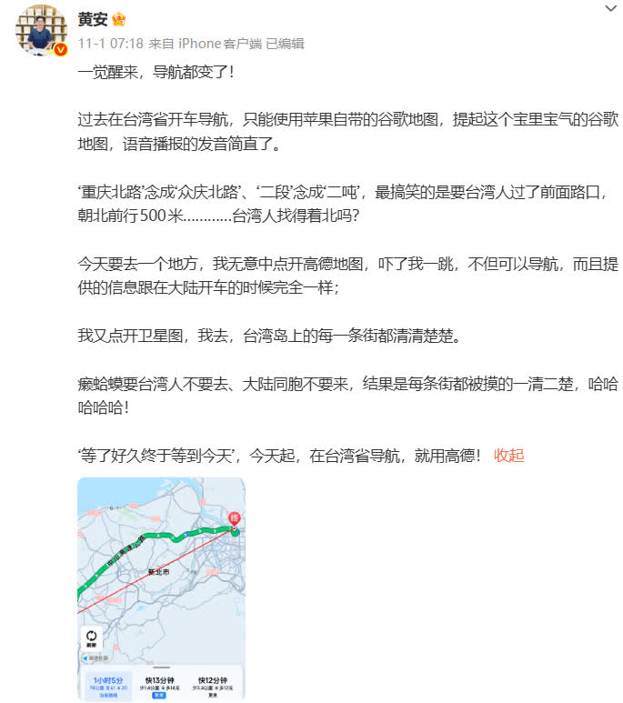 黃安發文稱,過去在台灣省開車導航,只能使用蘋果自帶的谷歌地圖,語音播報發音不准,把「重慶北路」念成「眾慶北路」、「二段」念成「二噸」。