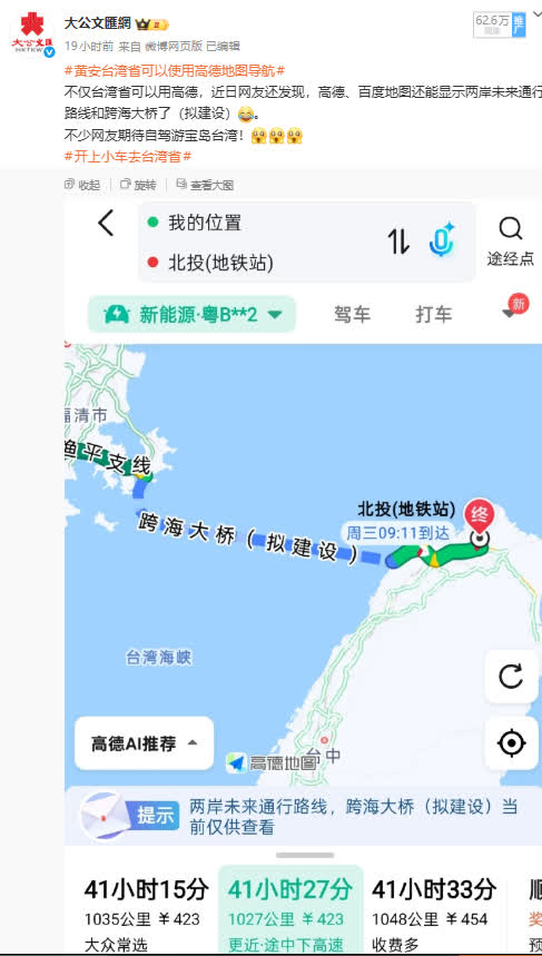 2024年5月,高德地圖官方小紅書賬號發布「看看你與台灣省的距離」的視頻,其中顯示,已可在地圖上查詢到導航路線。