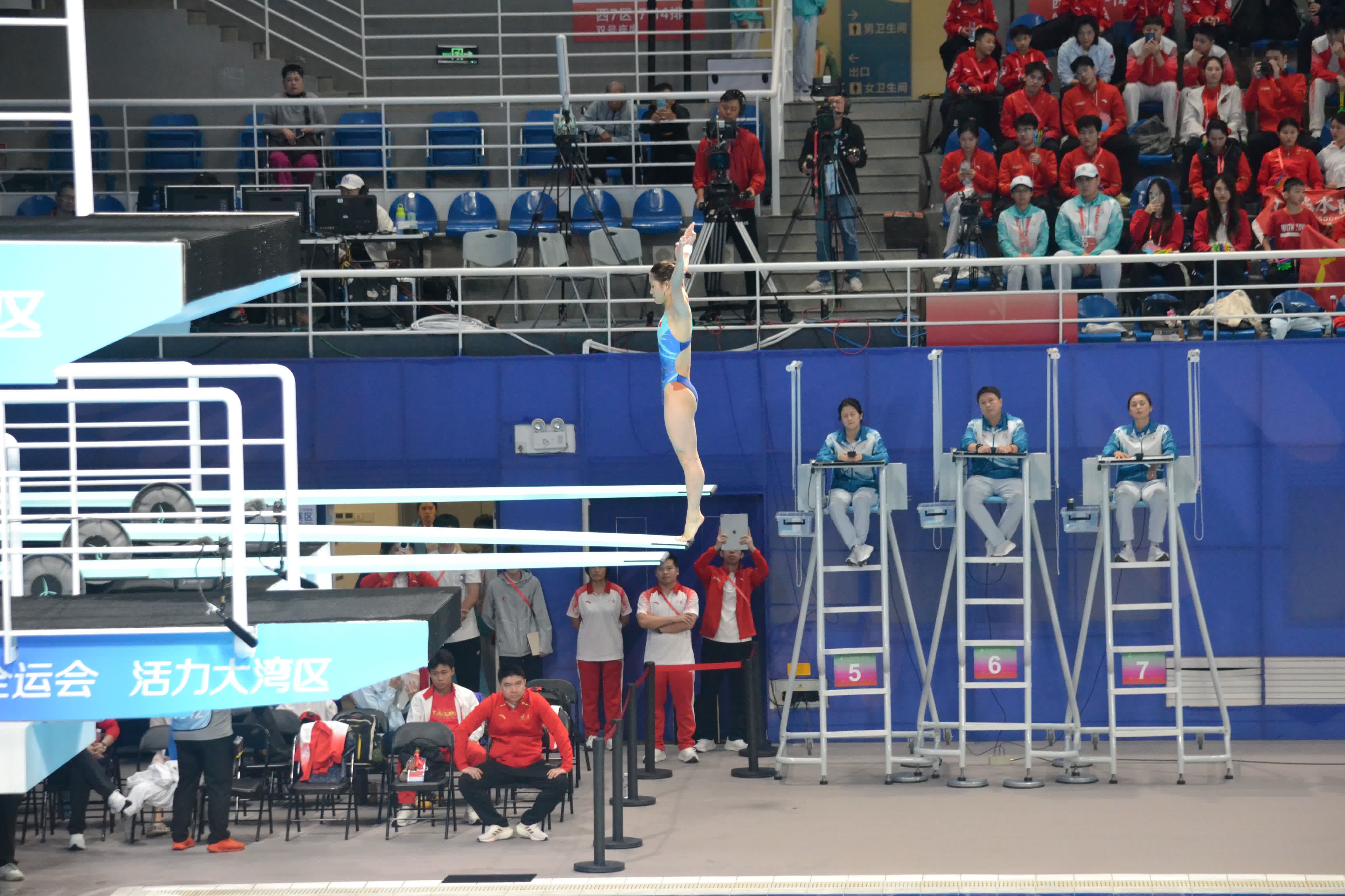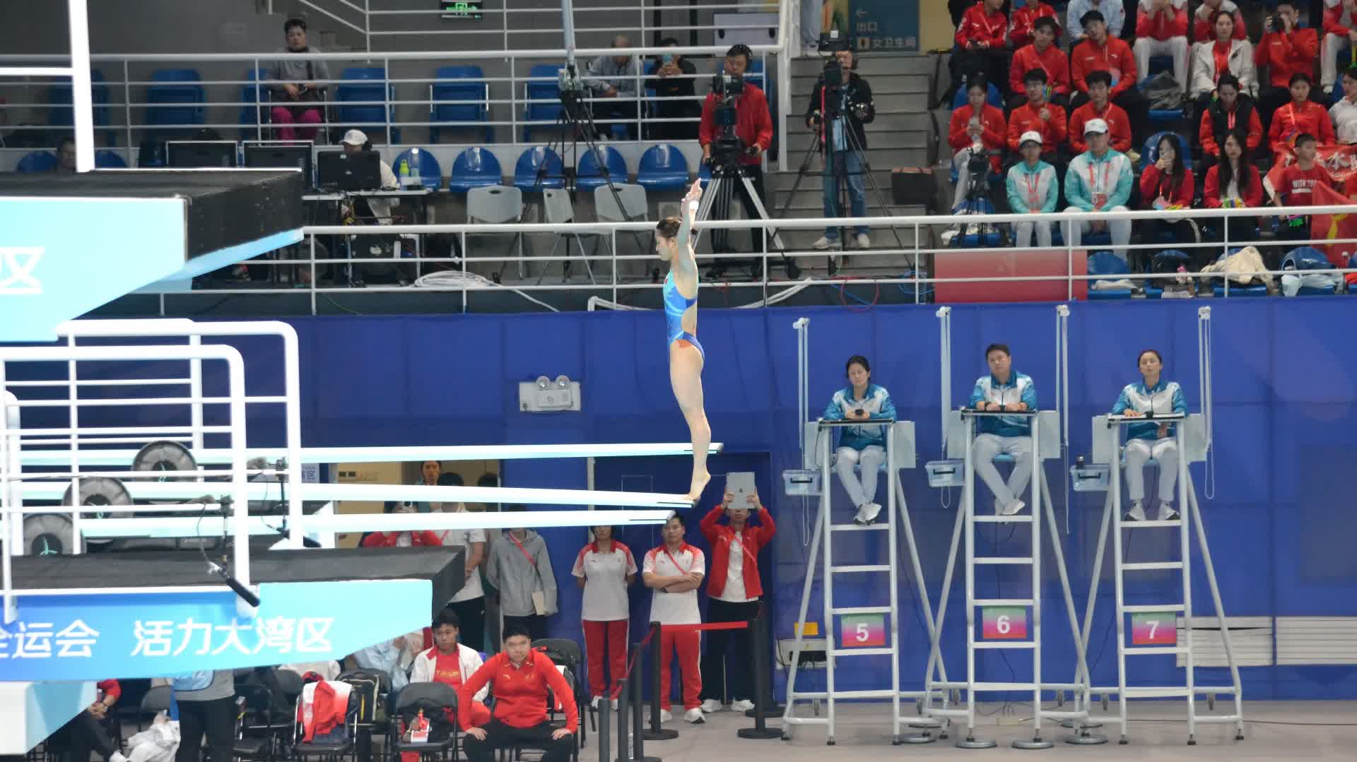 首先進行的是10米跳台對決,率先出場的王偉瑩第一跳動作發揮穩定,取得了70.50分;此後,在第二、三、五跳中都獲得75分以上。來自湖南隊的屈芷欣同樣發揮穩定,跳台項目結束後,兩人分別以362.45和347.12的成績位列前兩位。