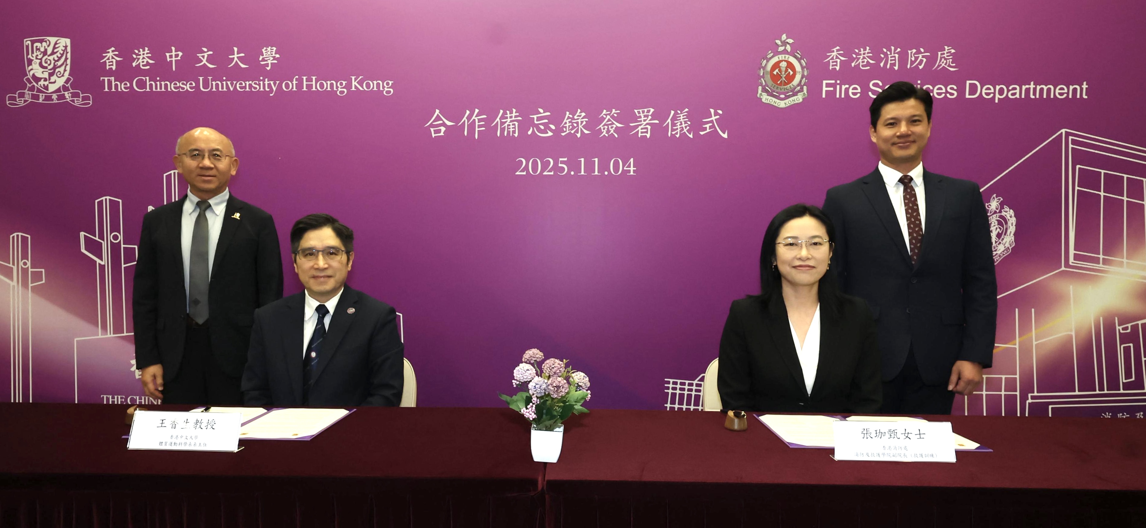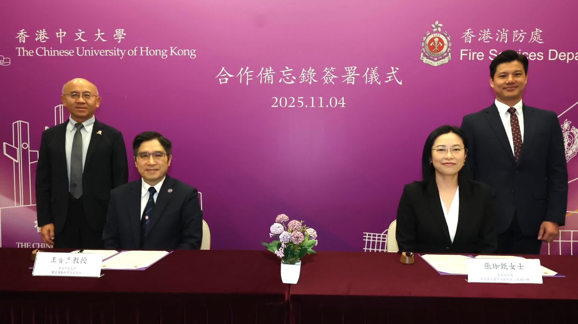 消防處與香港中文大學(中大)今日(十一月四日)簽署合作備忘錄,由消防及救護學院與中大的體育運動科學系和賽馬會公共衞生及基層醫療學院合作,共同舉辦有關緊急護理及應急準備的培訓課程,推動社區安全教育和青年全面發展。