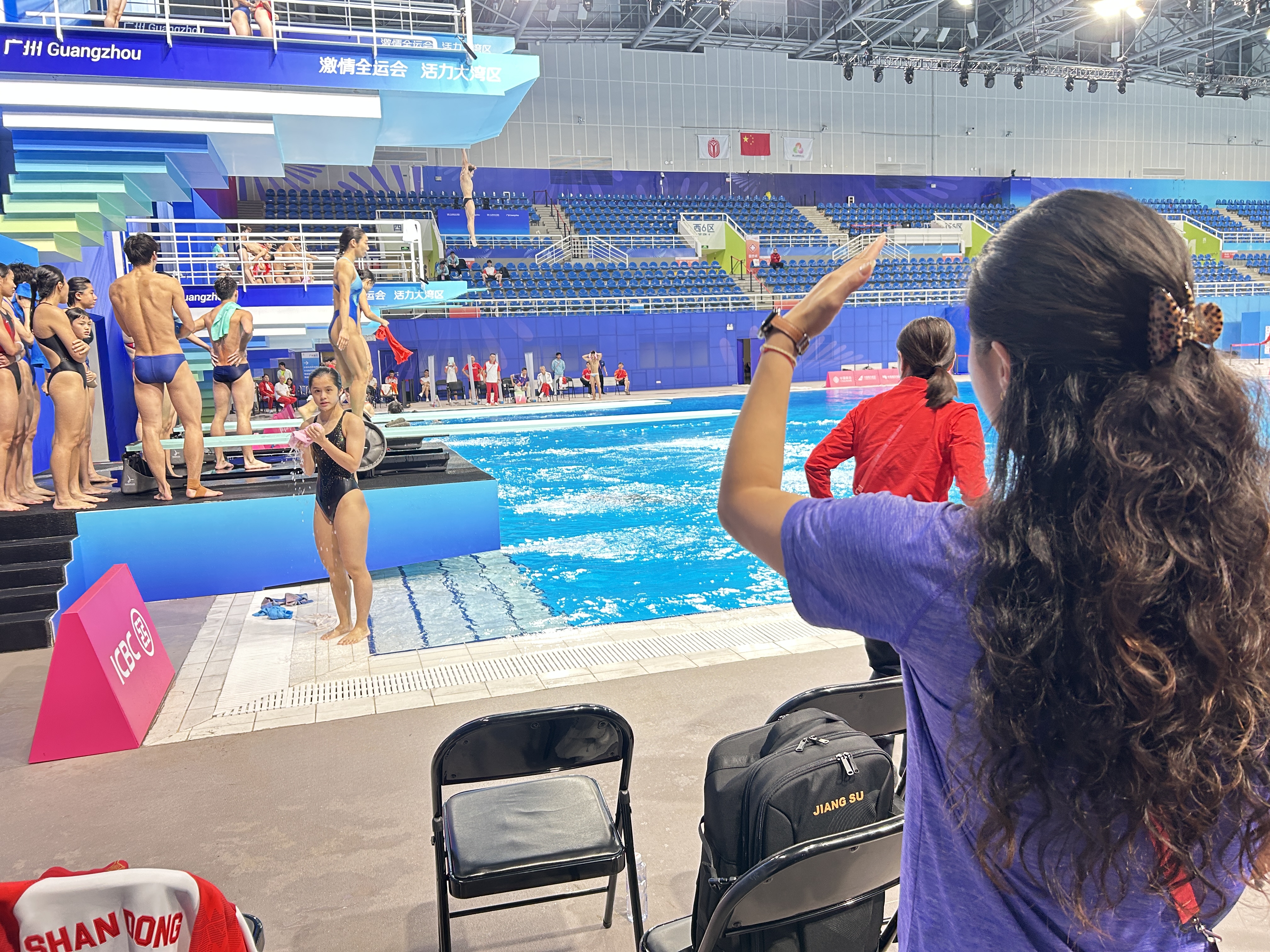 3日下午,香港跳水隊抵達廣州後,便從運動員酒店趕赴廣東奧體中心體育館,全體運動員到場觀賽。當晚,謝思埸、陳艾森、王宗源等多名奧運冠軍登場,比賽有如「神仙打架」。中國香港游泳總會主席、香港跳水隊領隊鄧永康說,全運會是頂級舞台,特別是跳水項目,競爭激烈程度和精彩程度甚至超過奧運會,對初登全運舞台的香港跳水隊來說,每一場比賽都是觀摩學習的絕佳機會。當晚沒有比賽任務的廣東跳水隊教練也出現在運動員觀賽區,粵港兩地選手坐在同一區域,不時互相交流,分析不同選手的技術特點和表現。