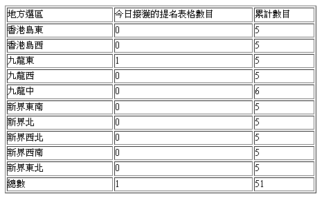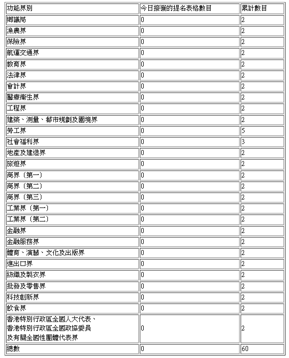 選舉委員會界別今日沒有接獲提名表格,至今累計數目為50份。